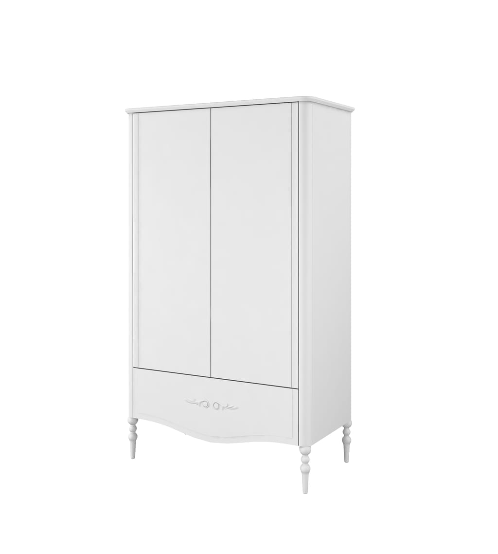 Szafa wykonana jest z bardzo dobrej jakości MDFu, drewna oraz płyty wiórowej, lakierowana jest certyfikowana farbą na kolor biały (RAL 9010).