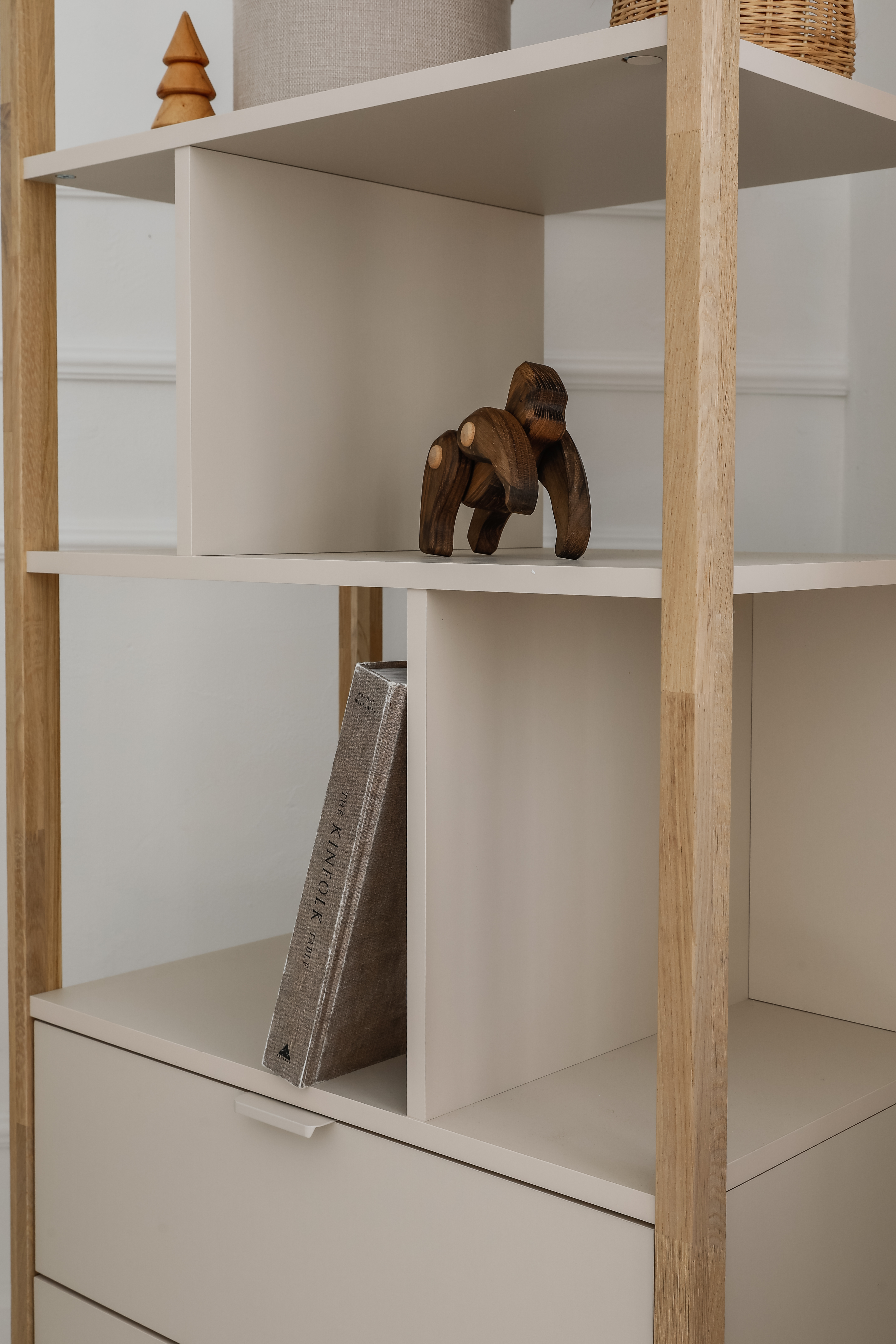 Kolor latte wprowadza do wnętrza ciepło i przytulność, a nogi z naturalnego drewna dębowego podkreślają nowoczesny charakter mebla. Regał jest pakowany na płasko i przeznaczony do samodzielnego montażu – w komplecie znajdują się wszystkie akcesoria oraz czytelna instrukcja. Dla zwiększenia bezpieczeństwa przewidziano możliwość przymocowania regału do ściany, co jest szczególnie ważne w pokoju dziecka.