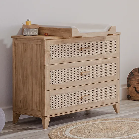 Drewniana komoda z funkcją przewijaka w stylu boho – naturalny rattan i lite drewno