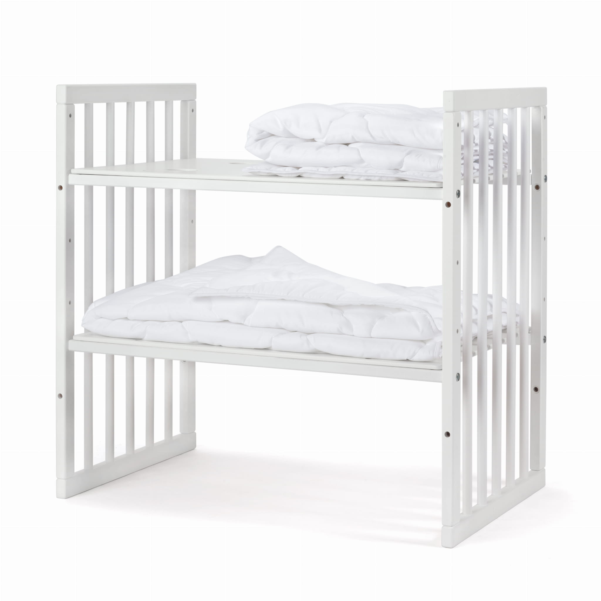 - Mniejsze łóżeczko: wysokość 75 cm, szerokość 77,5 cm, długość 77,5 cm