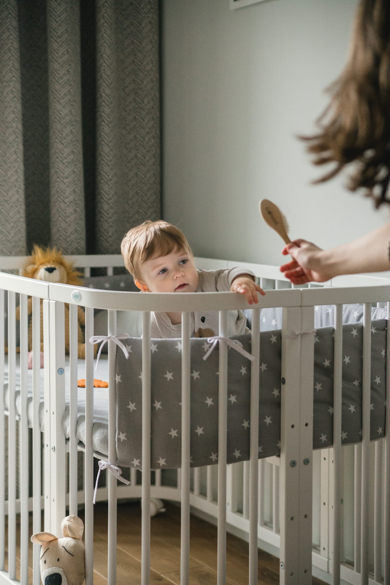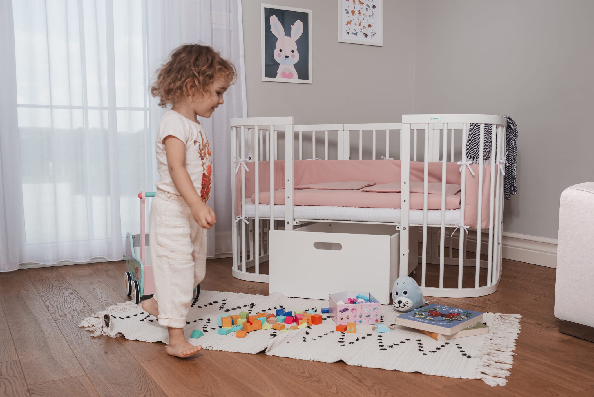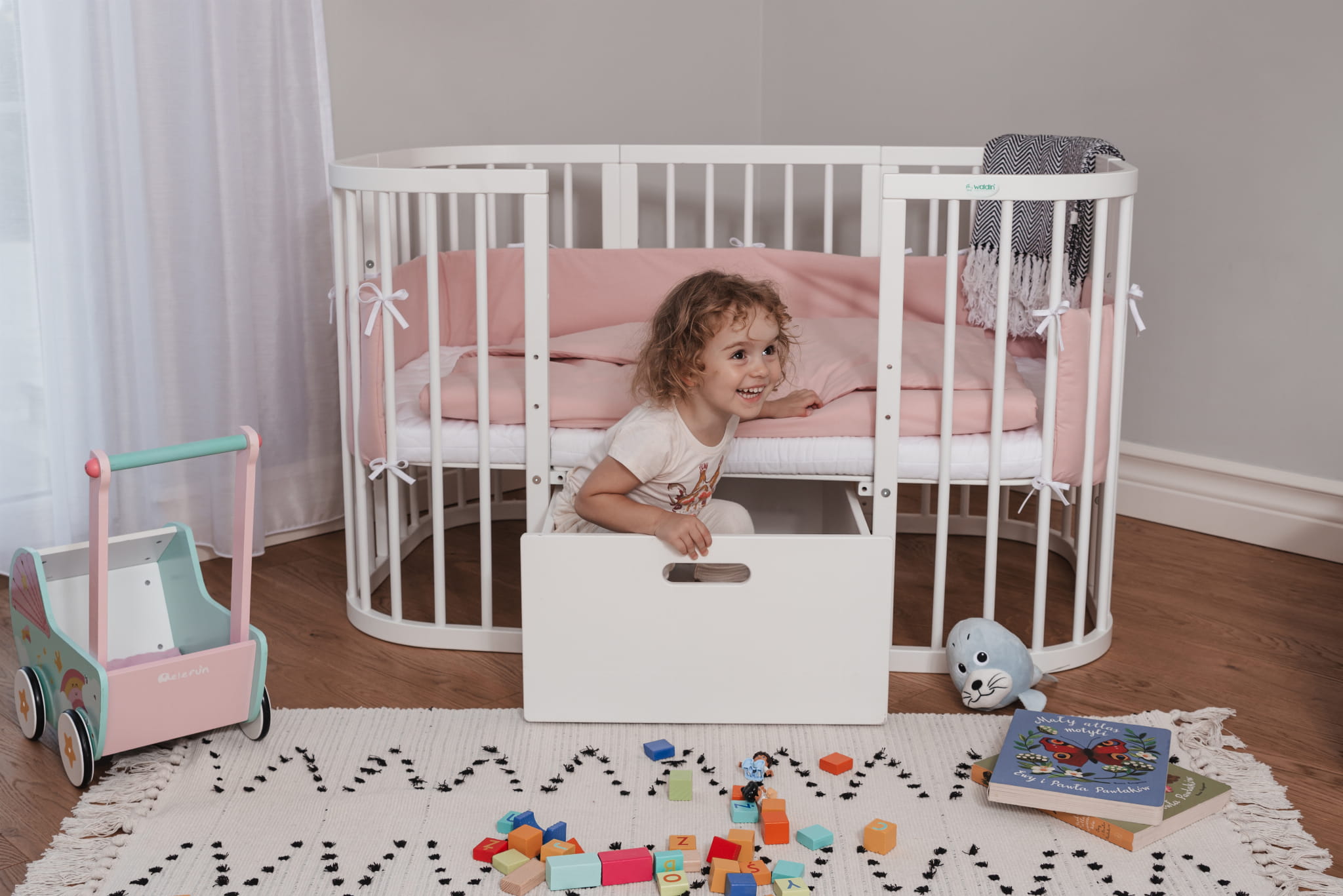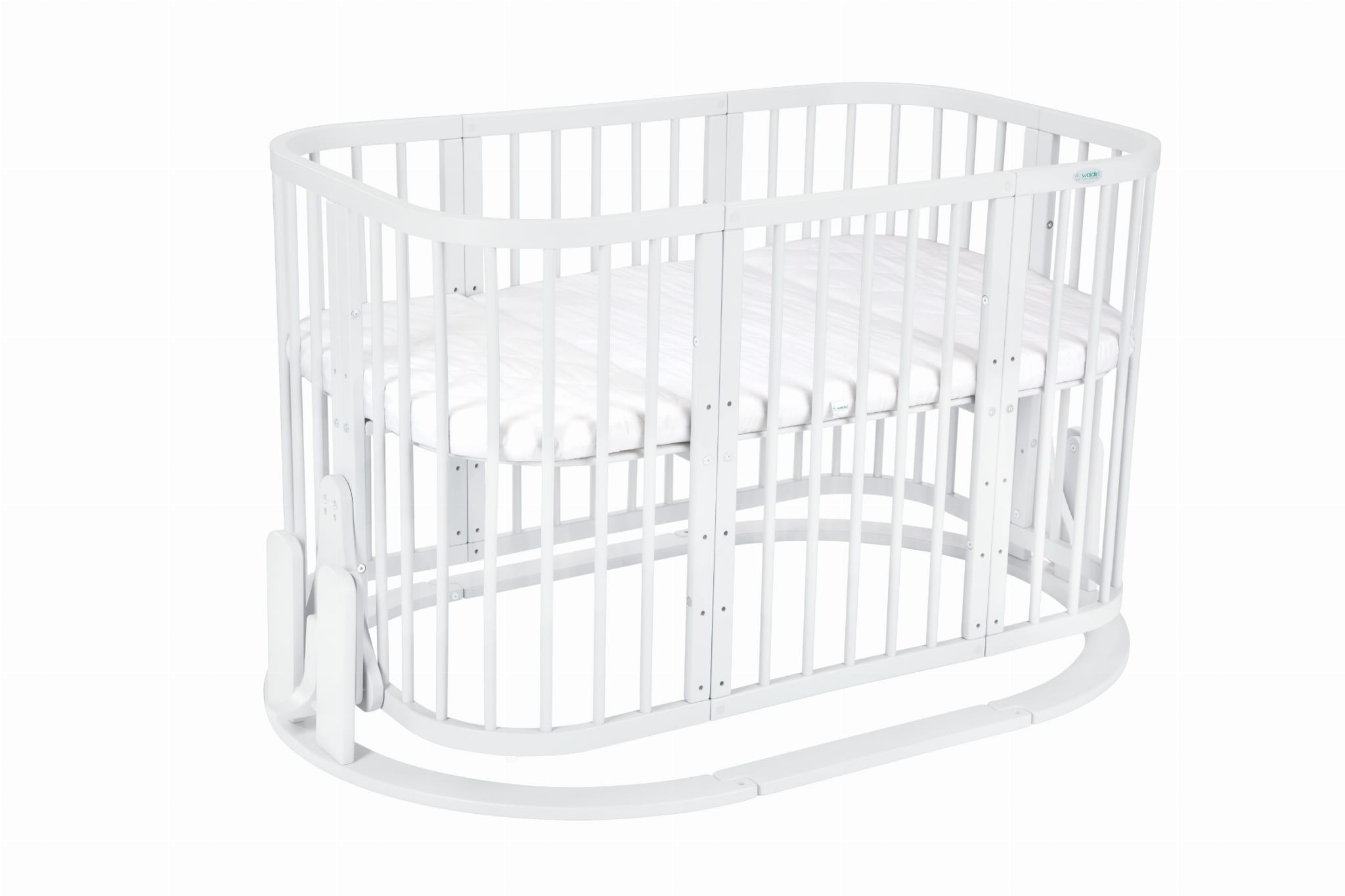 - Kołyska - Bujak do łóżeczka 7w1 to idealne rozwiązanie dla maluchów, które uwielbiają zasypiać w ruchu. Dzięki prostemu montażowi (wystarczy wsunąć konstrukcję łóżeczka w specjalne zaczepy po demontażu kółek) w kilka chwil stworzysz bezpieczną, delikatnie kołyszącą przestrzeń do snu. Uwaga: kołyska nie jest mobilna – po zamontowaniu nie przesuwaj konstrukcji. Można ją zamontować wyłącznie do łóżeczka z obniżoną podłogą maksymalnie do drugiego poziomu.
