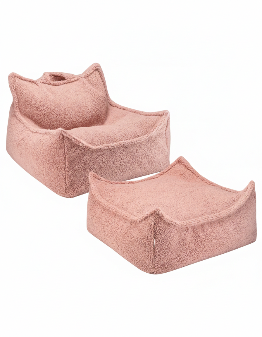 W skład zestawu wchodzi pufa sako o czystych liniach oraz dopasowany ottoman, które wspólnie tworzą przytulny kącik do czytania, relaksu lub zabawy. Pufa zapewnia doskonałe wsparcie dla pleców, natomiast wszechstronny ottoman świetnie sprawdza się jako podnóżek, dodatkowe siedzisko lub kreatywna powierzchnia do zabawy. Oba elementy są lekkie i łatwe do przenoszenia przez dziecko. Obicie z luksusowo miękkiej tkaniny typu teddy (baranek) w radosnym, różowym odcieniu nadaje wnętrzu wyjątkowo przytulny i ciepły charakter. Dedykowany dla dzieci w wieku od 3 do 9 lat.