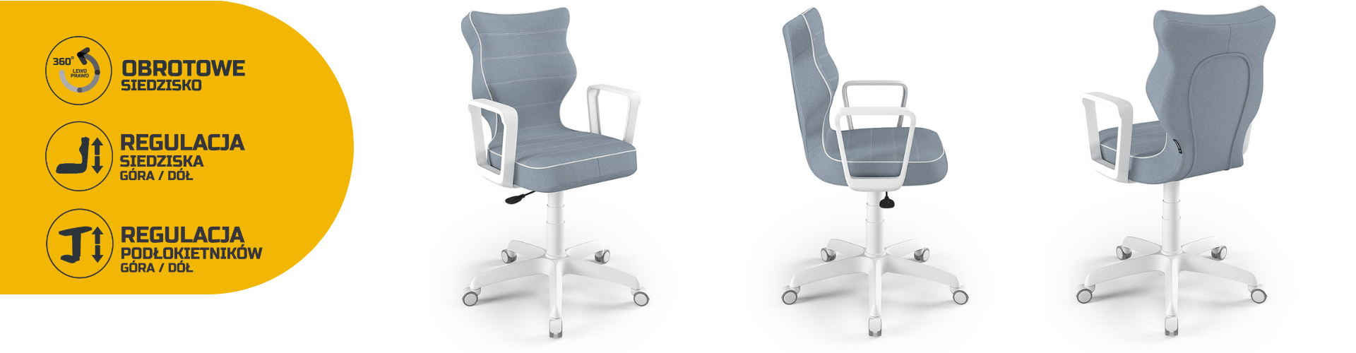 Nowoczesne, obrotowe krzesło biurkowe z podłokietnikami do pokoju nastolatka - gwarancja prawidłowej postawy ciała podczas najważniejszych dla fizycznego rozwoju człowieka lat. Obrotowe, regulowane krzesło przeznaczone jest do biurek o wysokości 70-82 cm.