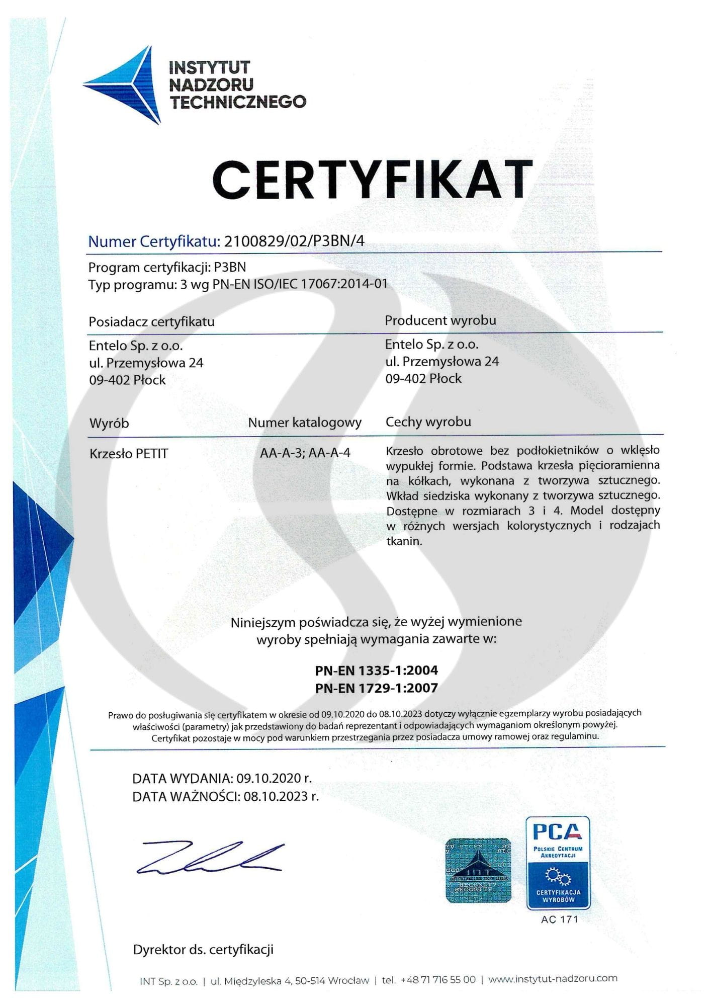 Dziecięce krzesło biurkowe zostało wyprodukowane w Polsce zgodnie z normą europejską. Siedziska zostały zaprojektowane w oparciu o normę PN-EN 1729 oraz przebadane pod kątem wytrzymałości zgodnie z normą PN-EN 1335. Wszystko to złożyło się mebel, który nie tylko nie zagraża zdrowiu użytkowników, lecz także aktywnie bądź pasywnie wspomaga funkcje ochronne.