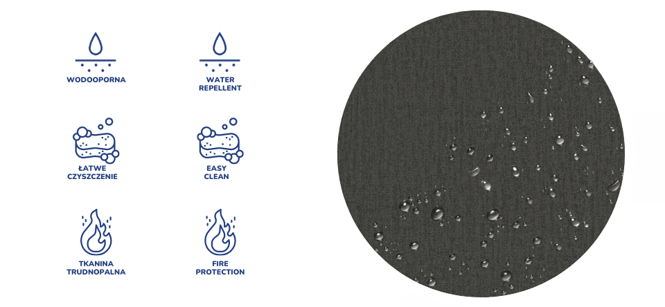 WATER REPELLEND - Tkanina MONOLITH pokryta jest specjalną warstwą ochronną, tworząca hydrofobową powłokę zabezpieczającą przed szybkim przesiąkaniem płynów. Zapobiega to natychmiastowemu absorbowaniu wody przez tkaninę, sprawiając że ciecz skrapla się na powierzchni materiału.