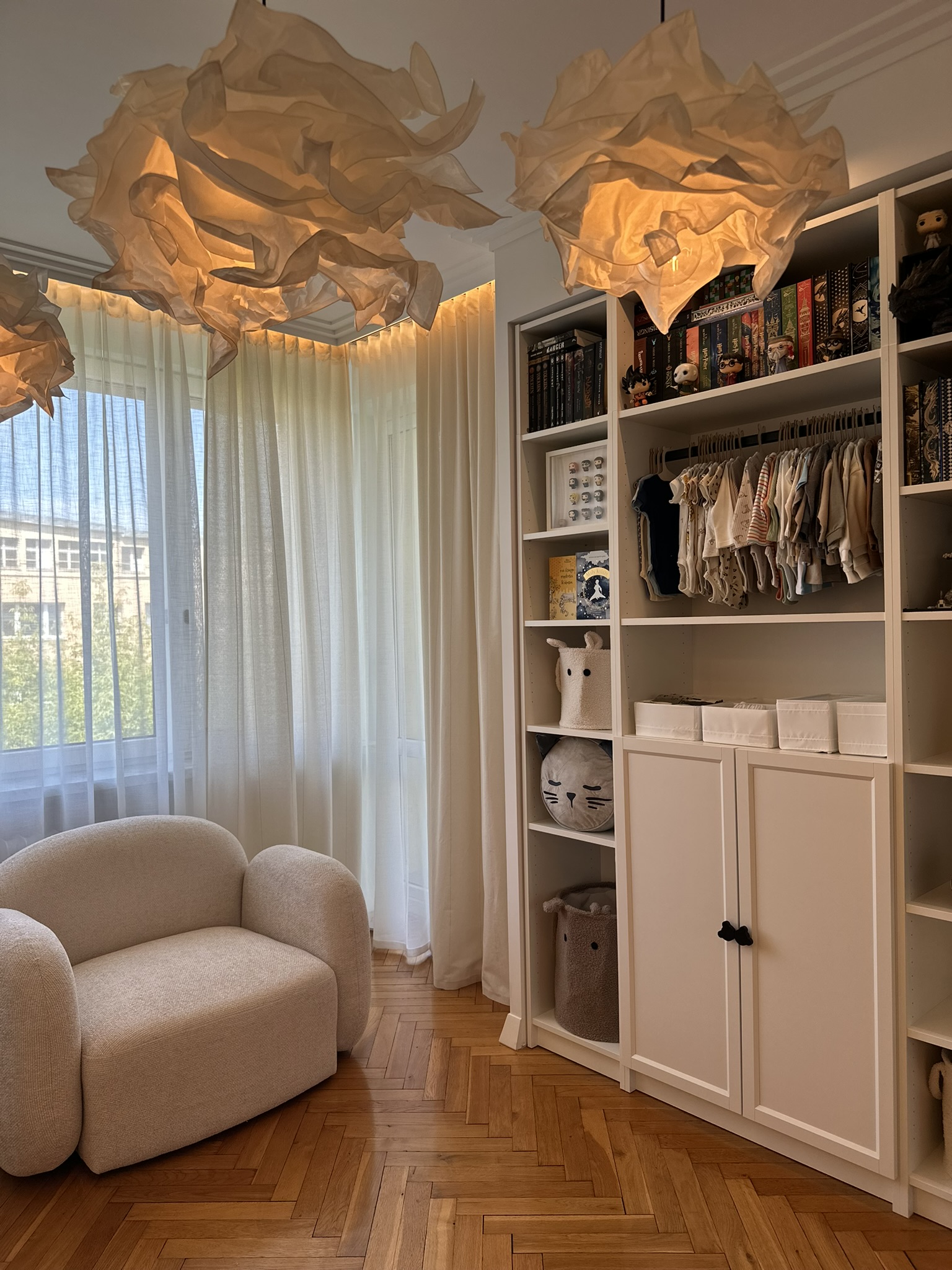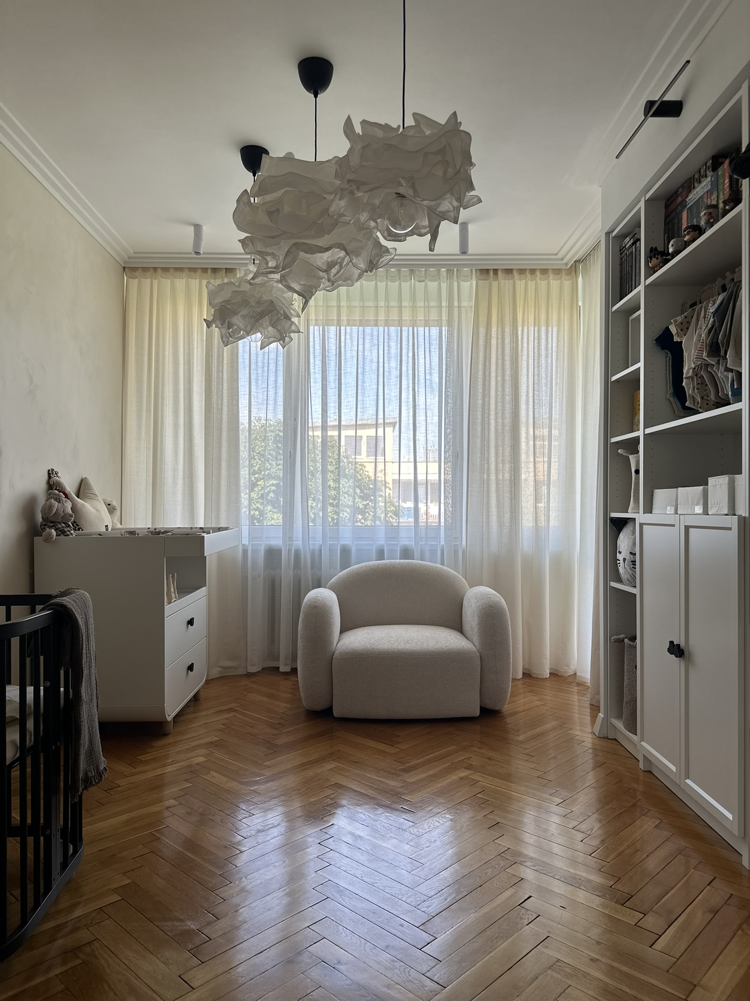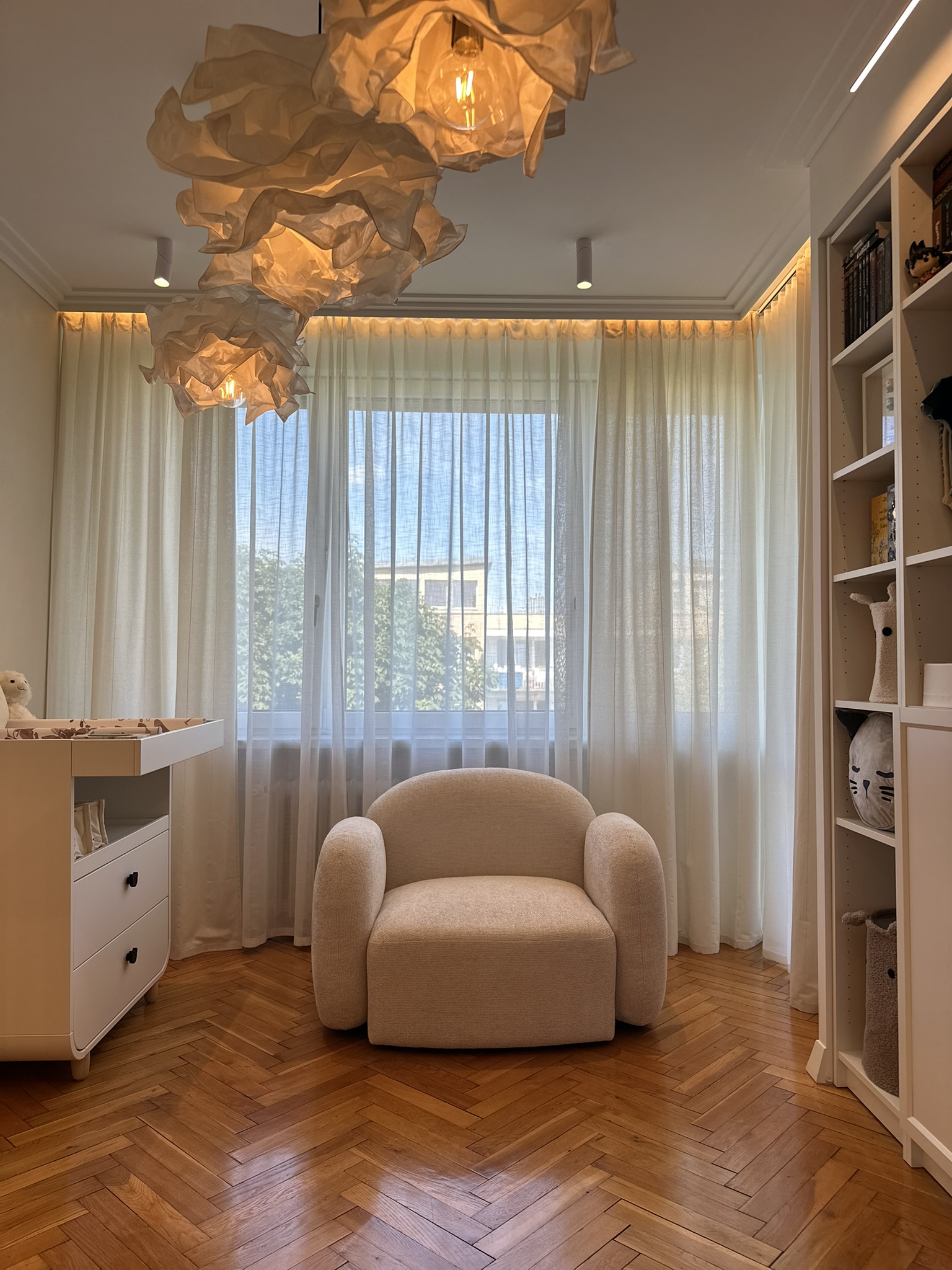 Wypełnienie z pianki poliuretanowej i watoliny zapewnia optymalne podparcie i komfort nawet podczas dłuższego siedzenia. Zaokrąglone kształty mebla sprawiają, że wnętrze zyskuje ciepły i nowoczesny charakter, a sam fotel szybko stanie się ulubionym miejscem relaksu – zarówno dla rodziców, jak i maluszka.