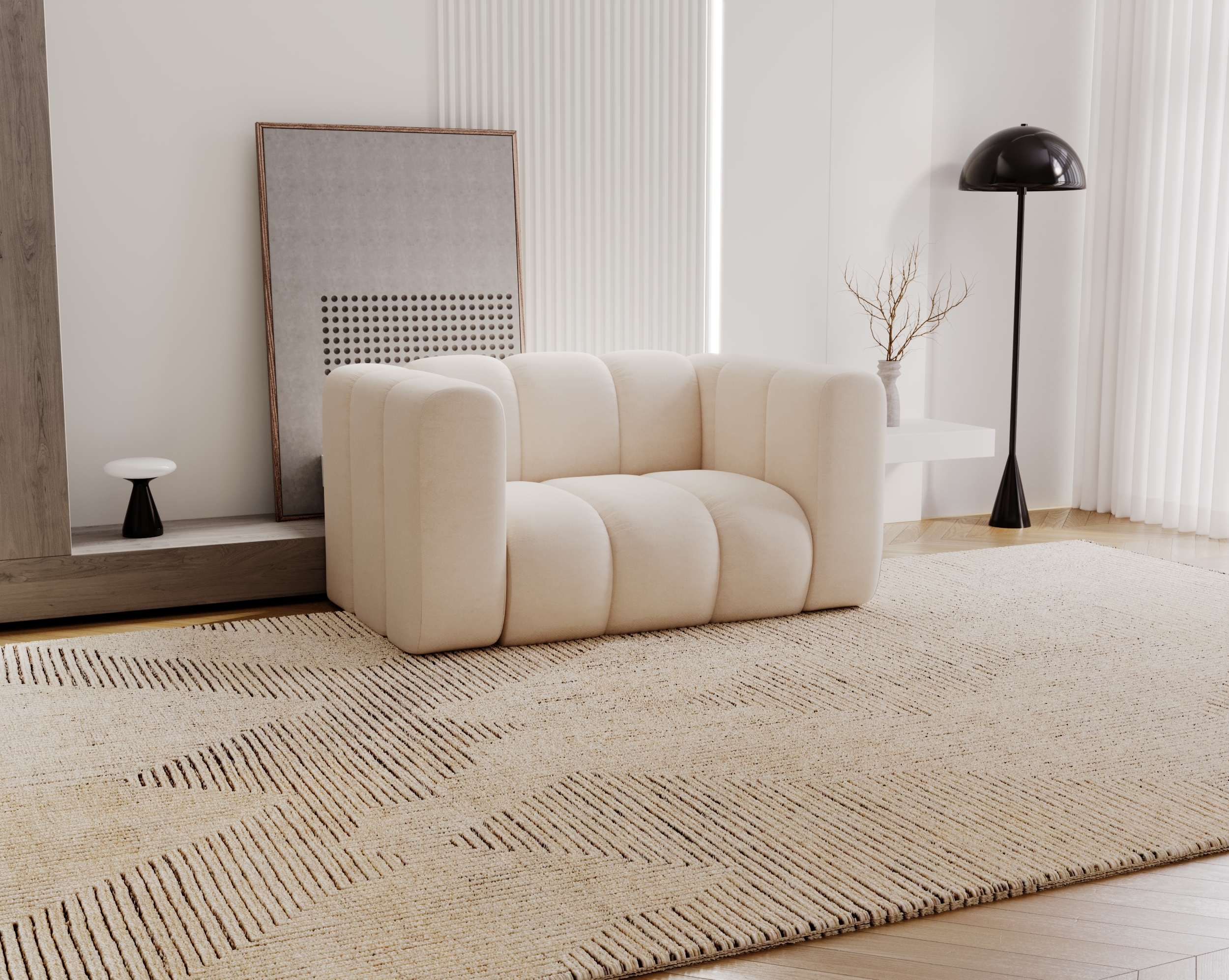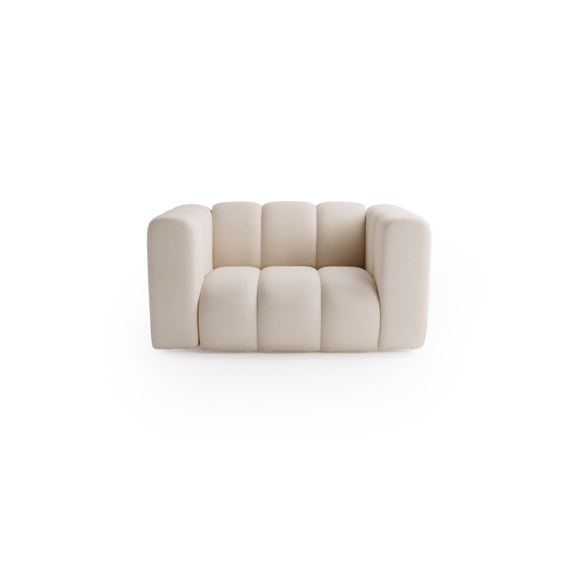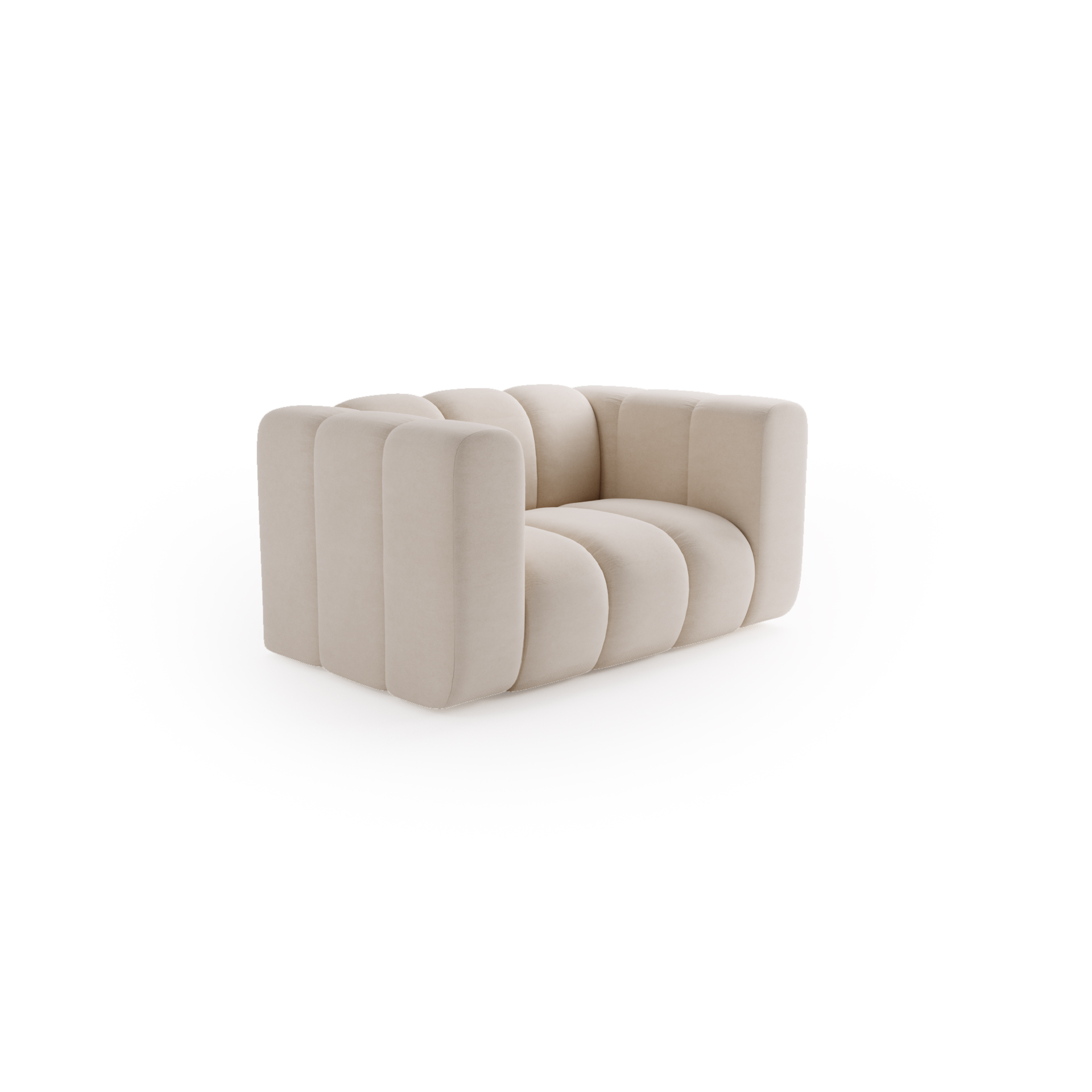 Lupe to fotel o rzeźbiarskiej formie i nowoczesnej elegancji, który zachowuje pełnię komfortu w kompaktowej bryle. Jego miękkie, zaokrąglone linie oraz pionowe przeszycia tapicerki nadają mu wyjątkowy charakter i sprawiają, że staje się centralnym punktem każdej aranżacji.