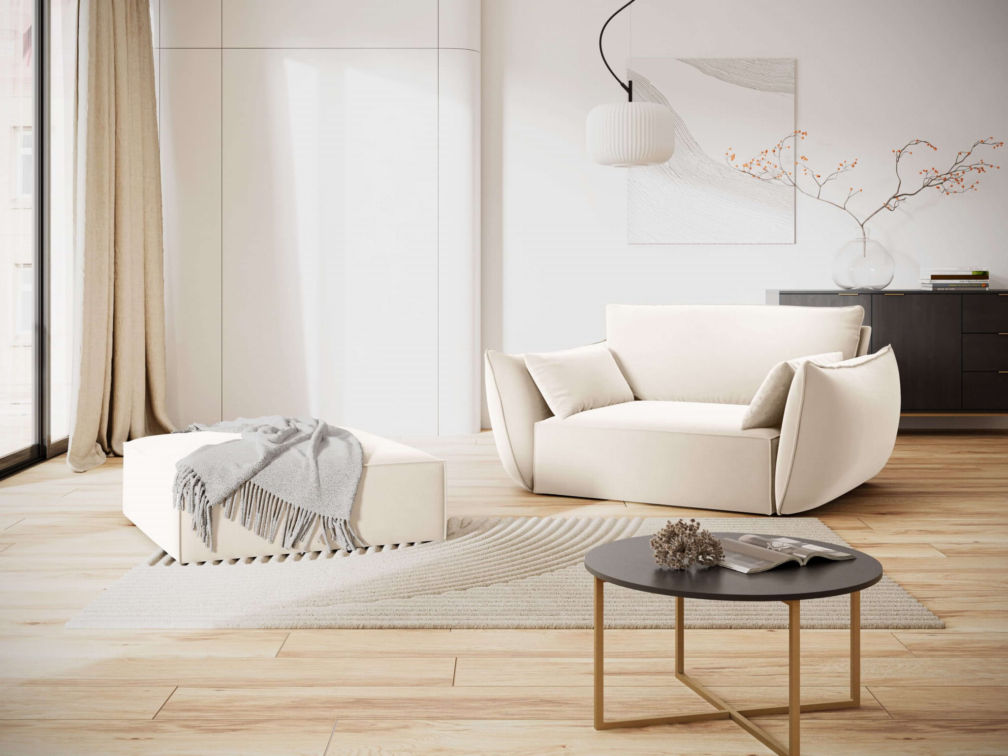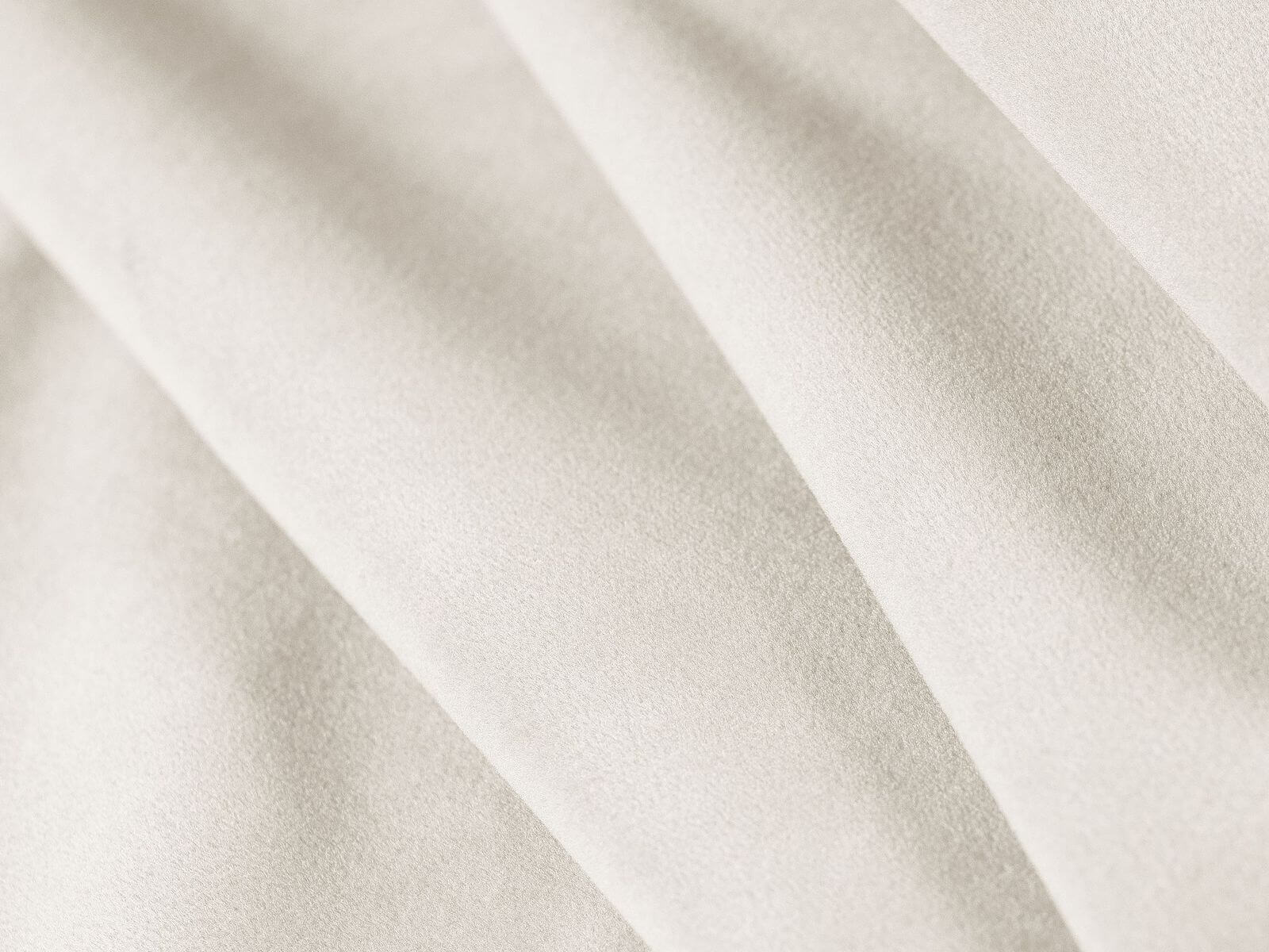 Tapicerka wykonana została z aksamitnej tkaniny Bluvel 22 w odcieniu jasnego beżu. Jest ona miękka i jedwabista w dotyku, subtelnie połyskuje, a przy tym wyróżnia się wysoką odpornością na ścieranie (50 000 cykli Martindale’a). Tkanina spełnia także normy bezpieczeństwa, w tym test papierosowy PN-EN 1021-1:2014-12.