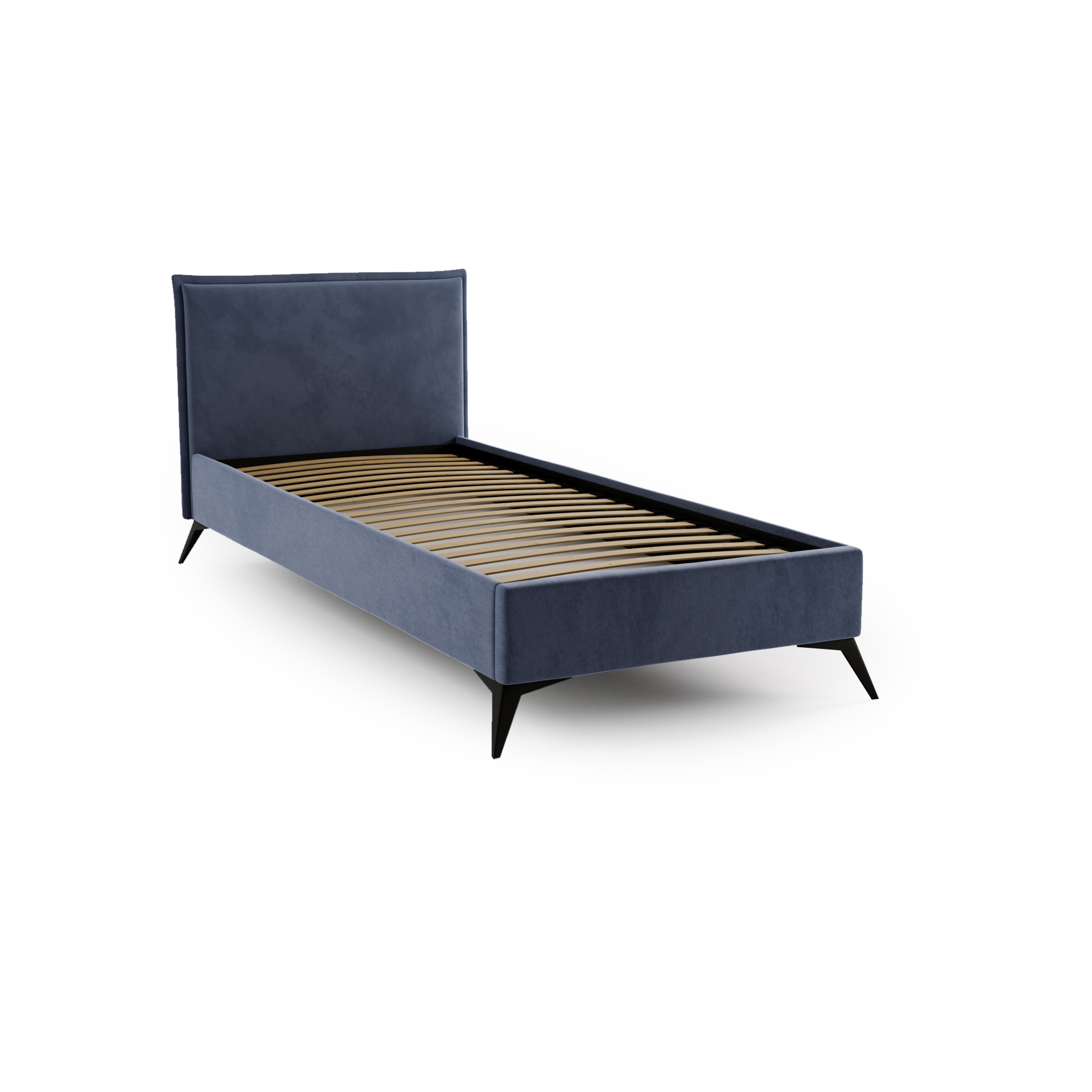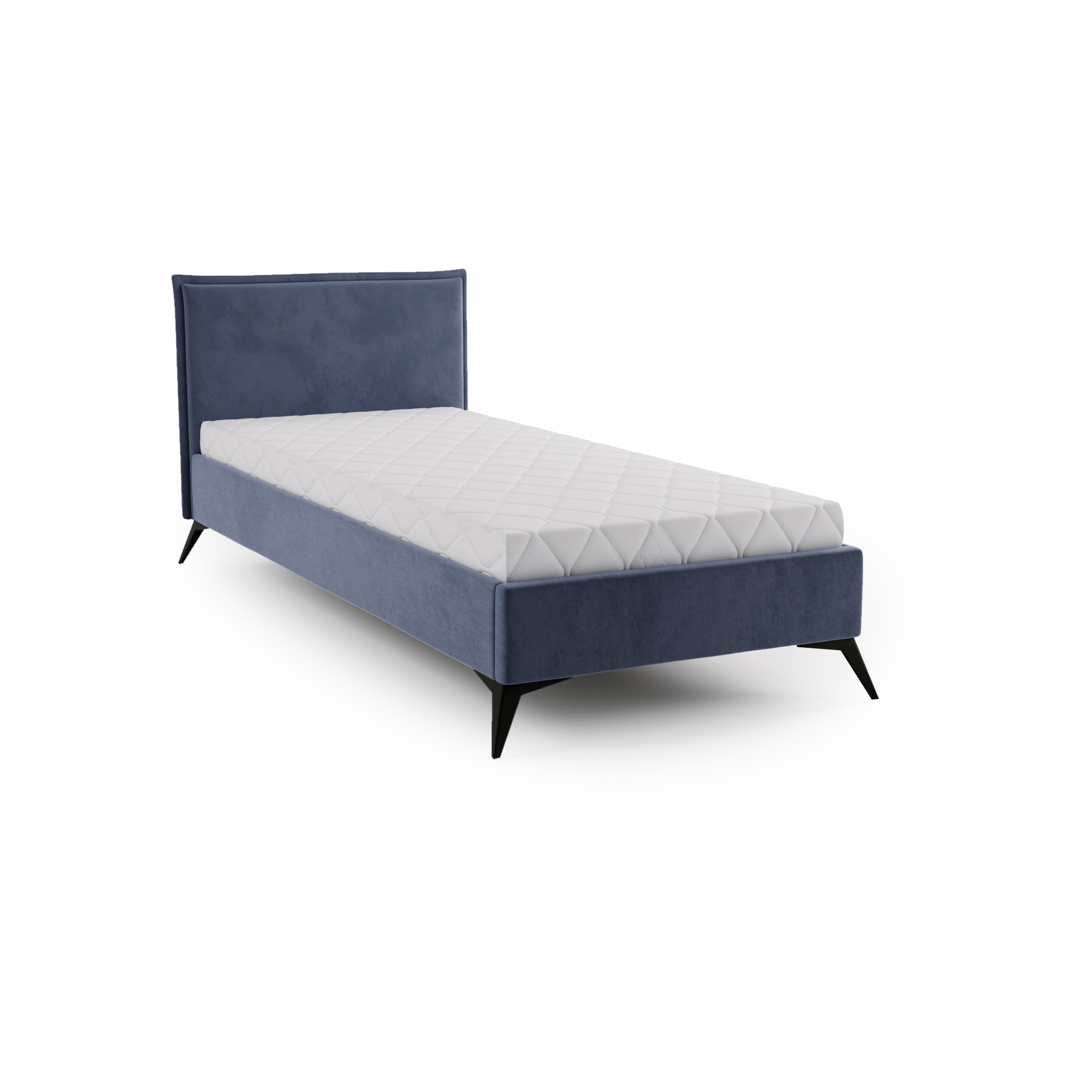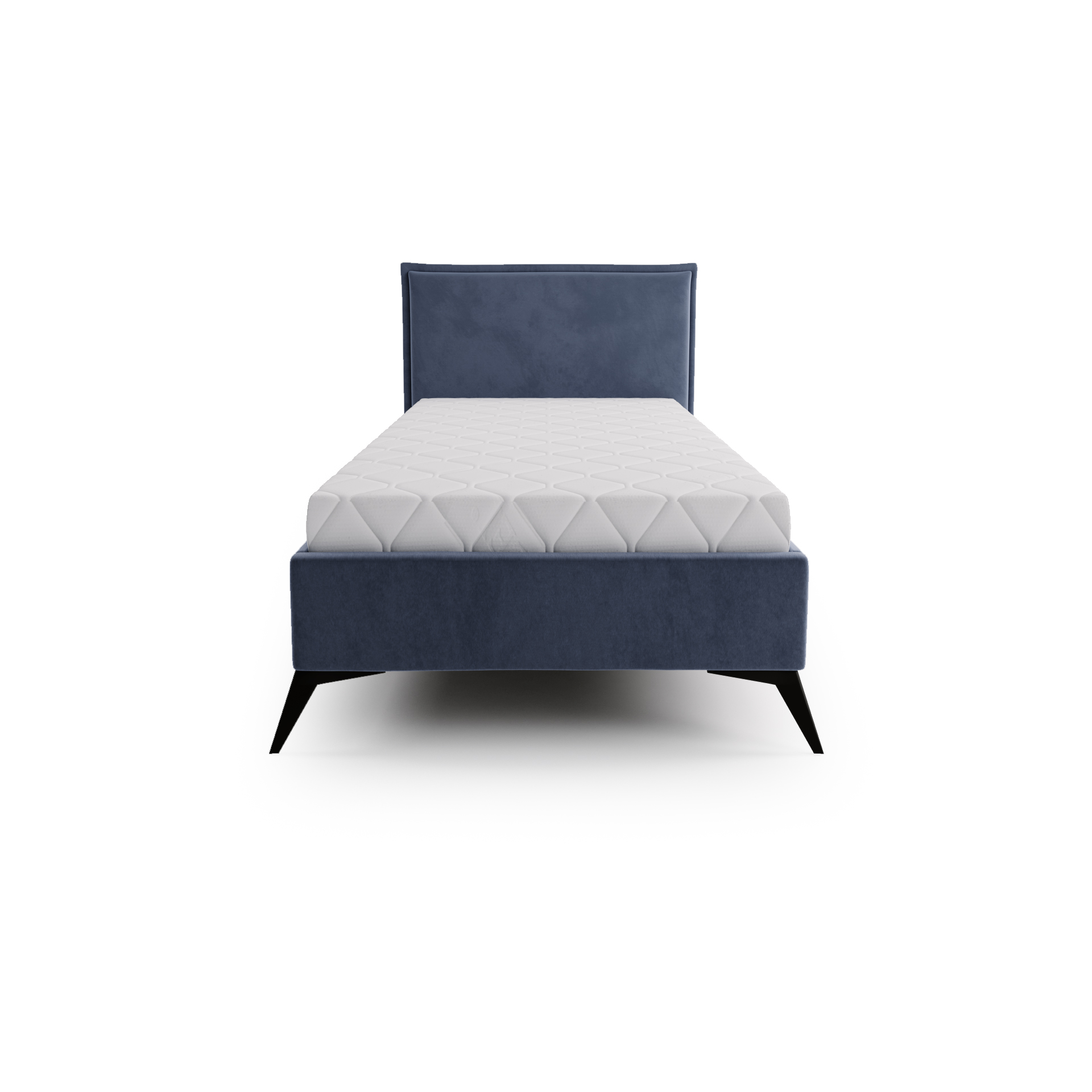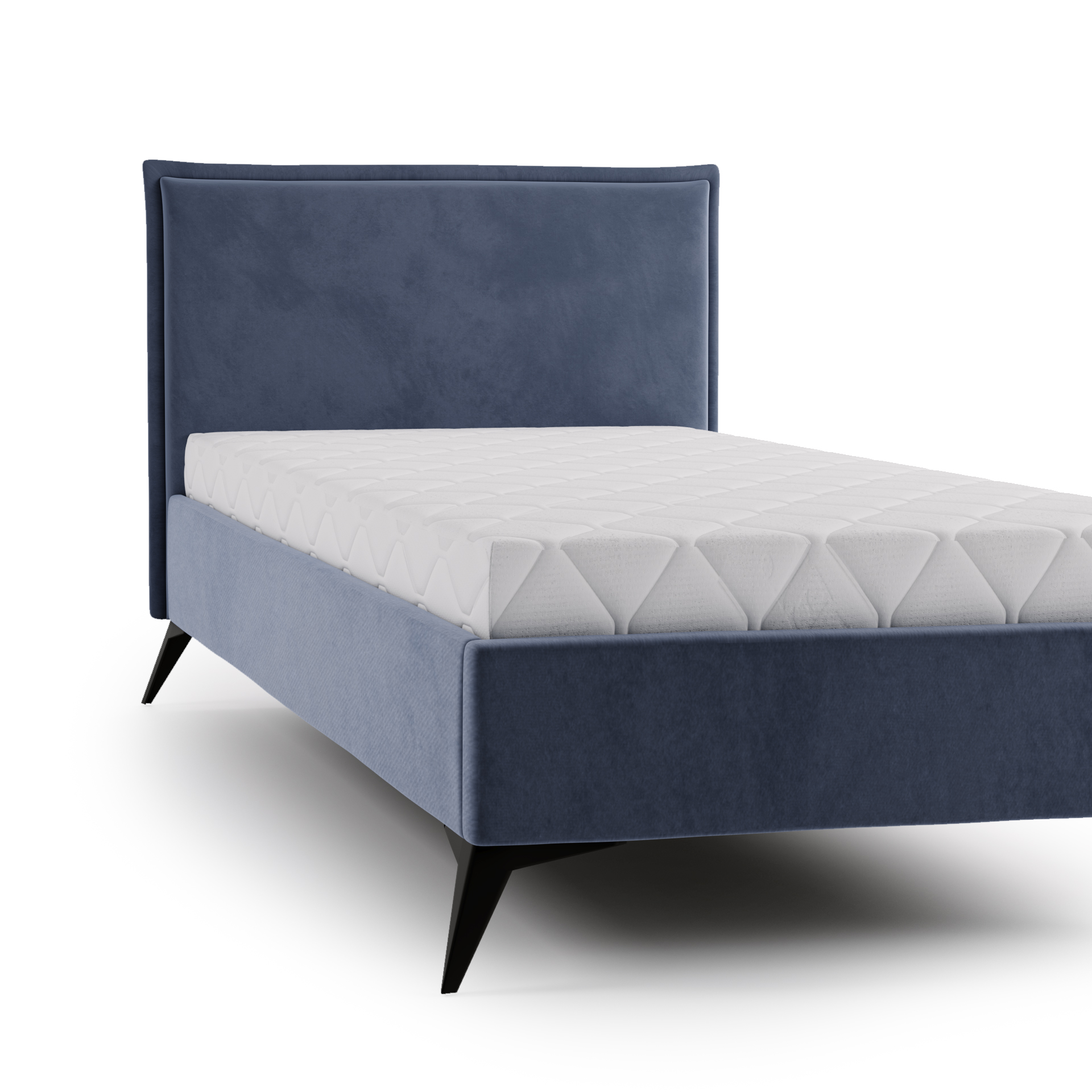 Solidna konstrukcja oparta jest na metalowych nogach, lekko wygiętych na zewnątrz, które dodają łóżku lekkości, a jednocześnie zapewniają trwałość i stabilność podczas codziennego użytkowania. Tapicerowany zagłówek pozwala wygodnie oprzeć się podczas wieczornej lektury, porannego relaksu lub oglądania ulubionych filmów, tworząc przytulne i funkcjonalne miejsce do odpoczynku.