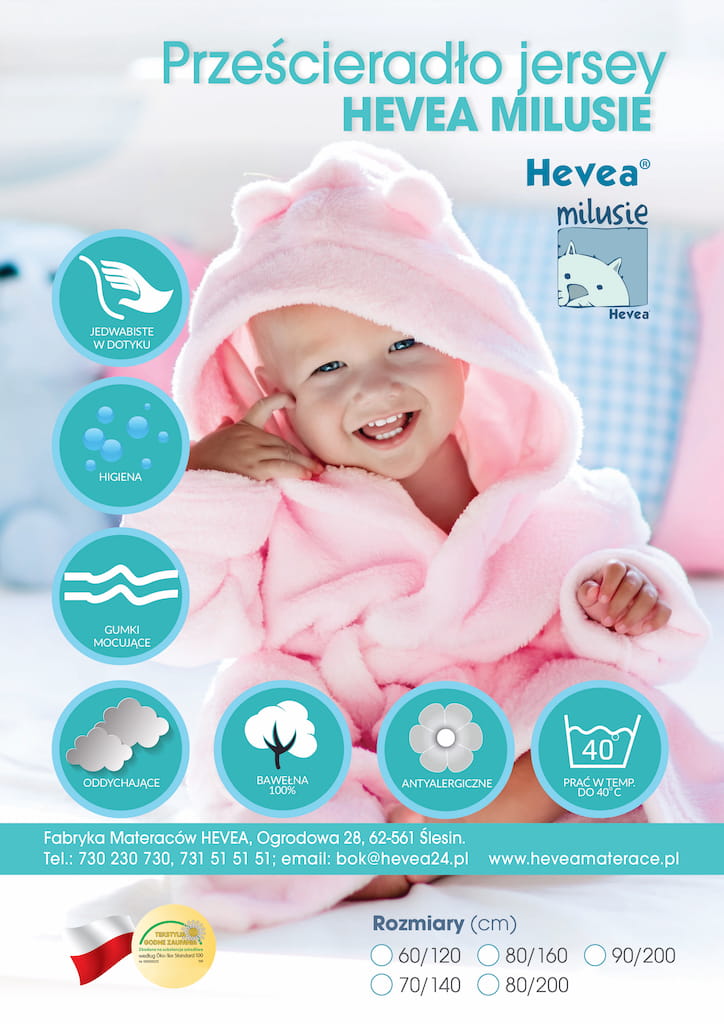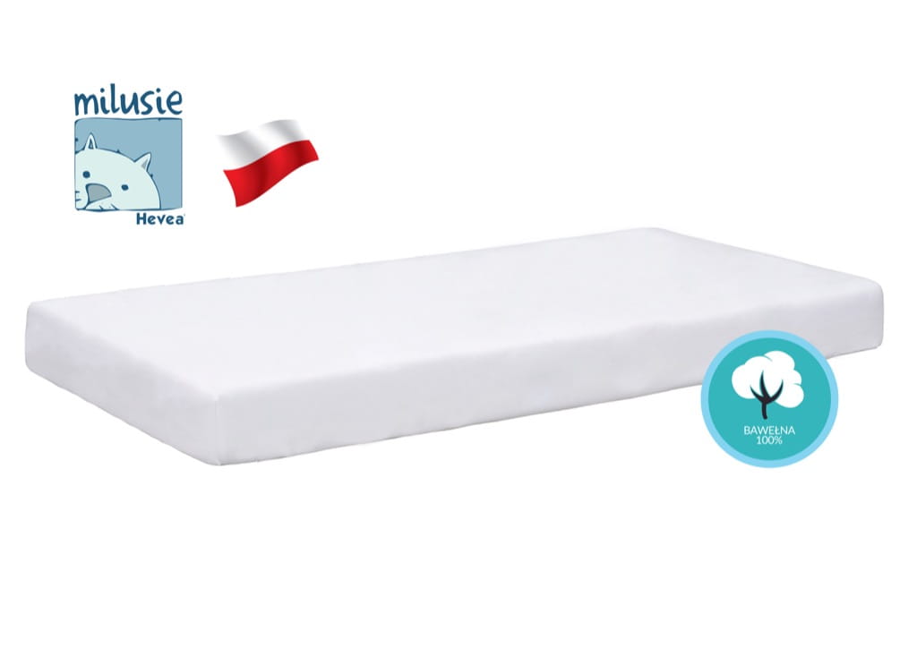 Bawełniane prześcieradło z gumką Hevea Milusie dedykowane jest do materacy dla niemowląt i dzieci starszych. Wykonane z białego jerseyu 100% bawełna spełni oczekiwania najbardziej wymagających rodziców.