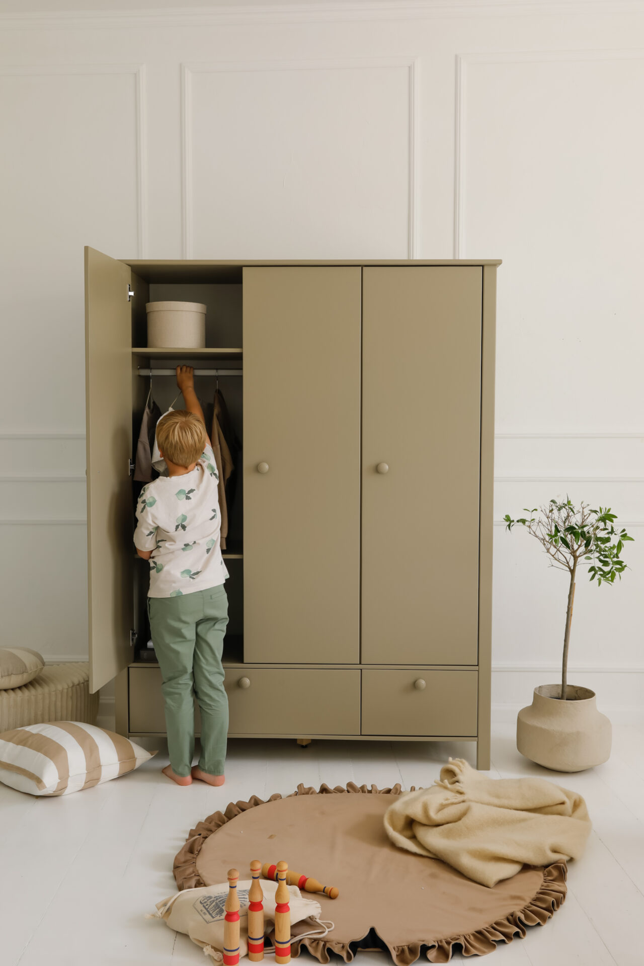 Za eleganckimi drzwiami kryją się praktyczne półki i drążek na ubrania, a u dołu znajdują się dwie dodatkowe pojemne szuflady. Wszystko to sprawia, że szafa Collet z łatwością pomieści codzienną garderobę oraz wszystkie dziecięce skarby.
