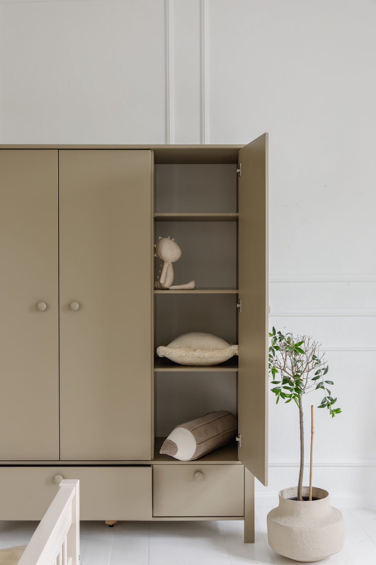 Za eleganckimi drzwiami kryją się praktyczne półki i drążek na ubrania, a u dołu znajdują się dwie dodatkowe pojemne szuflady. Wszystko to sprawia, że szafa Collet z łatwością pomieści codzienną garderobę oraz wszystkie dziecięce skarby.