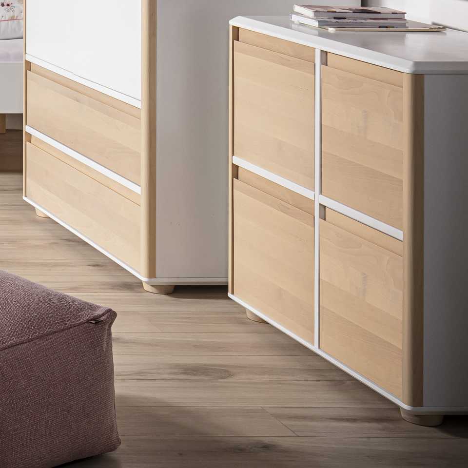 Ta czterodrzwiowa komoda to idealne rozwiązanie do przechowywania dziecięcych skarbów, ubrań i drobiazgów. Jej skandynawski charakter został ocieplony drewnem brzozowym, które nadaje wnętrzu przytulności i elegancji.
