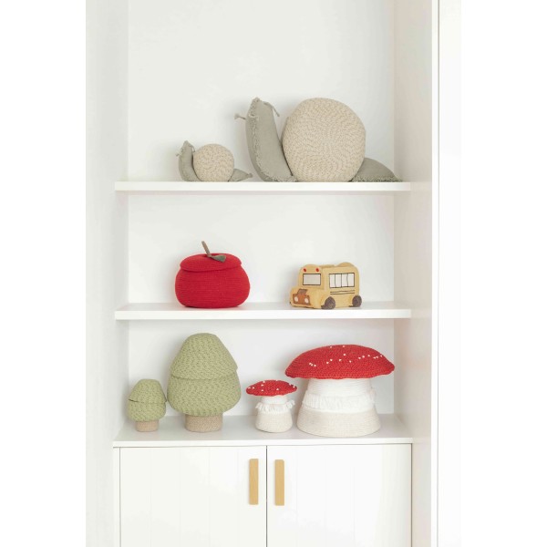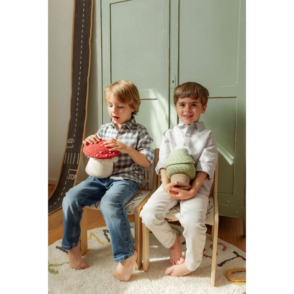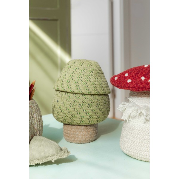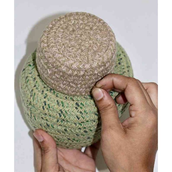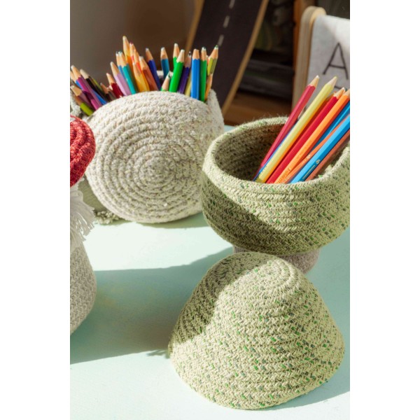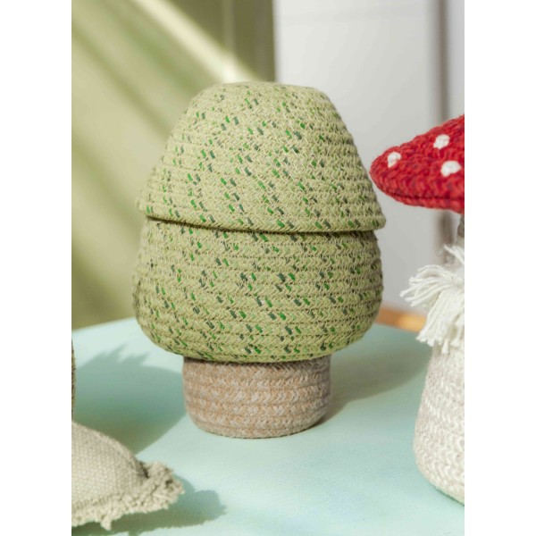 Zaproś do wnętrza odrobinę zieleni z naszym koszem Mini Tree – ręcznie wykonanym z bawełnianych sznurków wypełnionych włóknami pochodzącymi z recyklingowanych butelek PET. Choć niewielki, przyciąga uwagę żywymi odcieniami zieleni i błękitu, nawiązującymi do kolorystyki lasu.