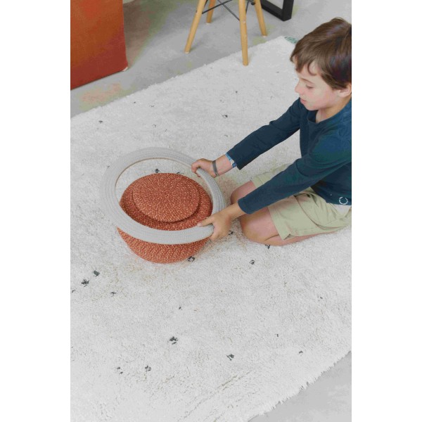 Pozwól swojej wyobraźni odlecieć poza gwiazdy dzięki Basket Saturn! Ręcznie wykonany z plecionego bawełnianego sznurka w żywych kolorach czerwieni, miodu, terakoty i pomarańczy, wzmocniony włóknami PET z recyklingu dla dodatkowej trwałości.