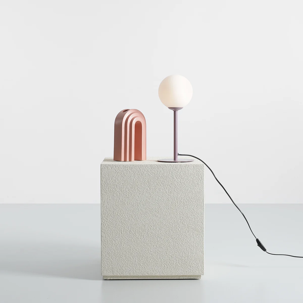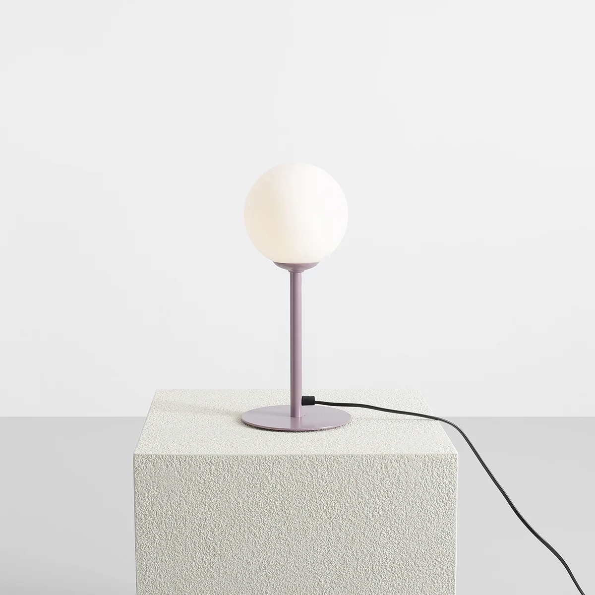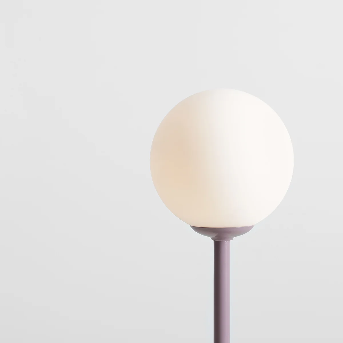 Ta minimalistyczna lampa stołowa to eleganckie połączenie prostoty formy i funkcjonalności. Jej głównym elementem jest okrągły, matowy klosz wykonany z mlecznego szkła, który delikatnie rozprasza światło, tworząc przyjemny, miękki efekt. Całość wspiera prosty, metalowy trzon w kolorze fioletowym, który nadaje lampie nowoczesny charakter.