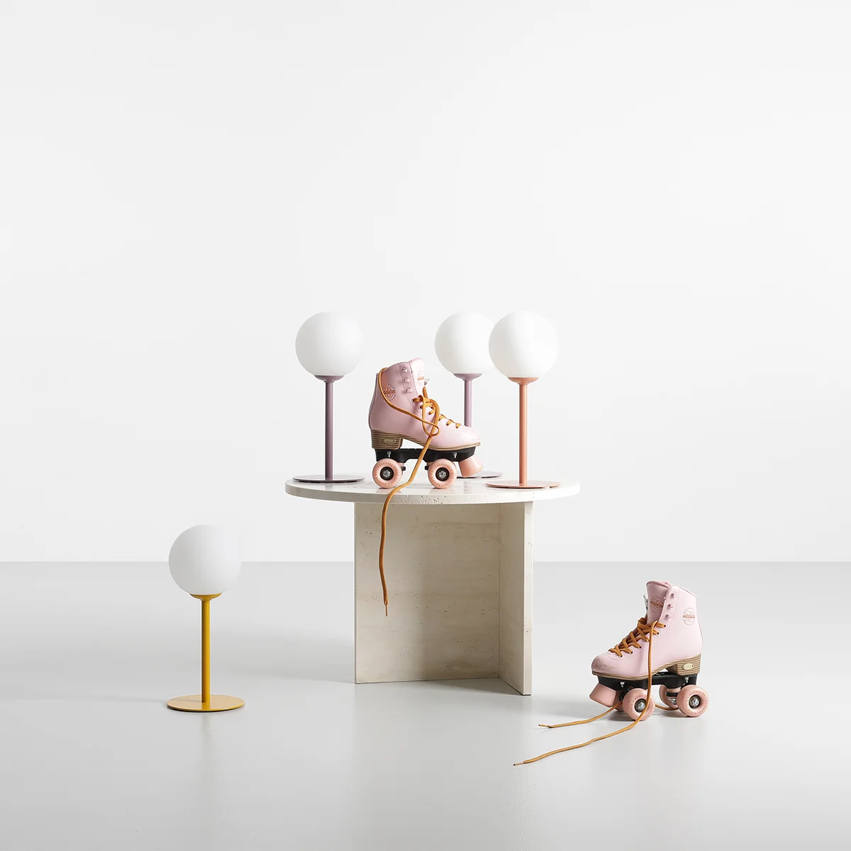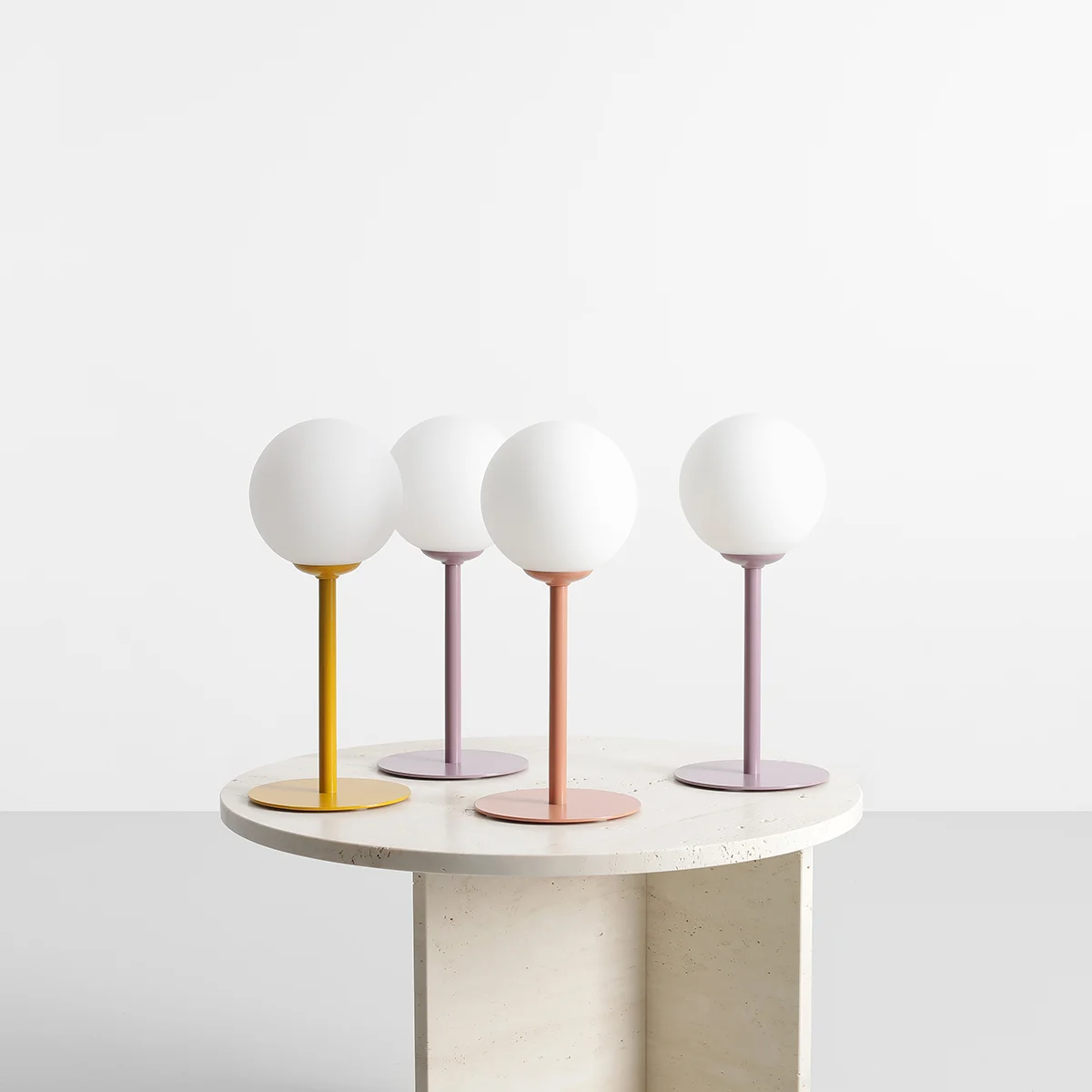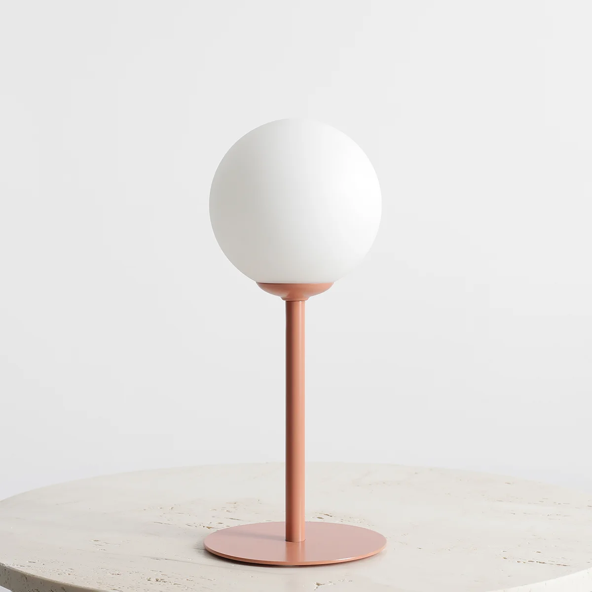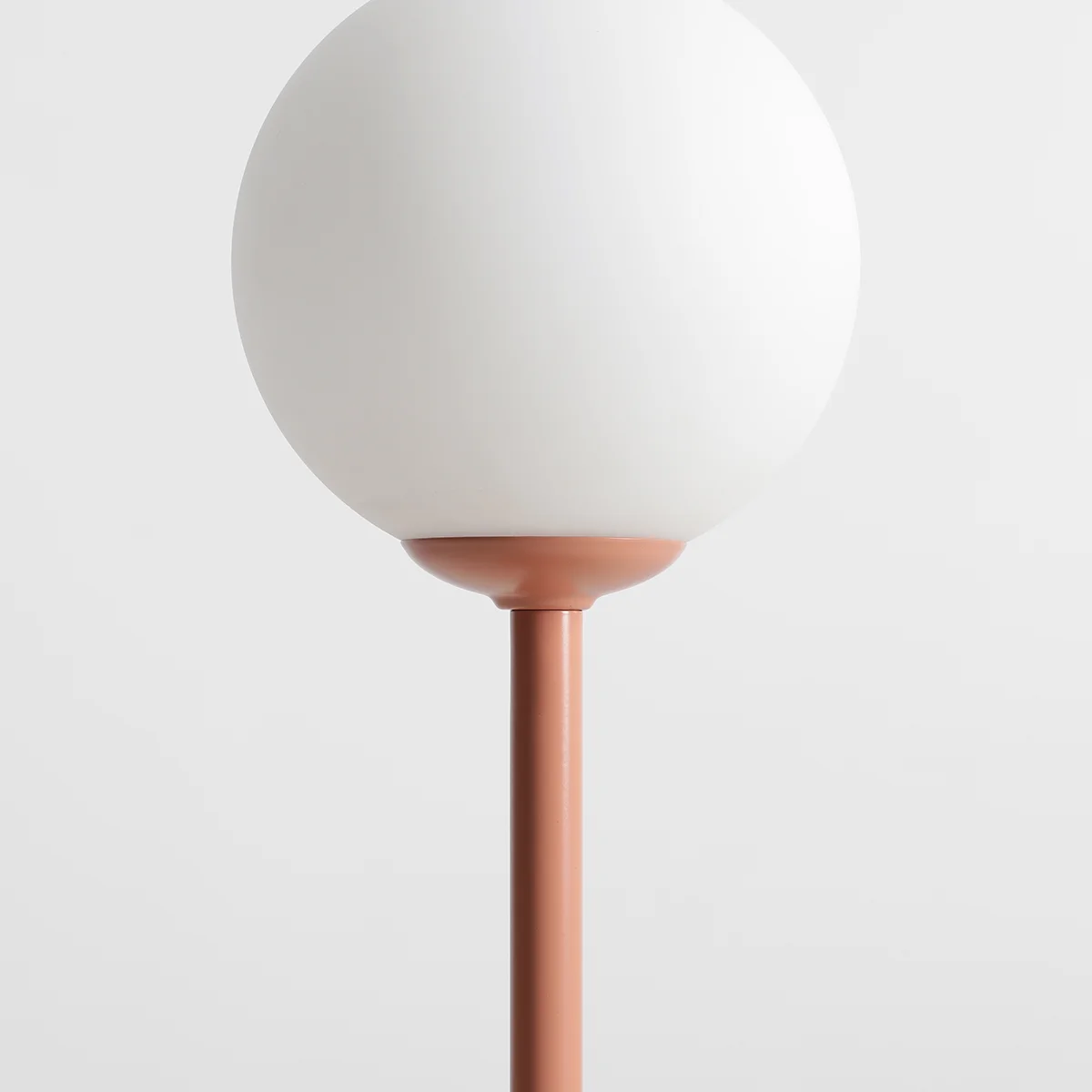 Ta minimalistyczna lampa stołowa to eleganckie połączenie prostoty formy i funkcjonalności. Jej głównym elementem jest okrągły, matowy klosz wykonany z mlecznego szkła, który delikatnie rozprasza światło, tworząc przyjemny, miękki efekt. Całość wspiera prosty, metalowy trzon w kolorze koralowym, który nadaje lampie nowoczesny charakter.
