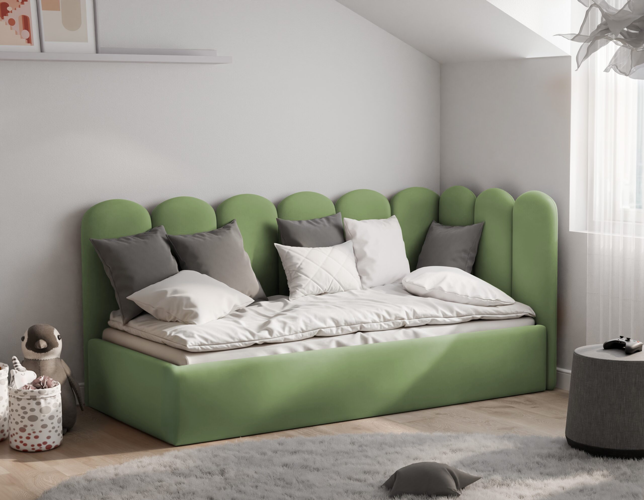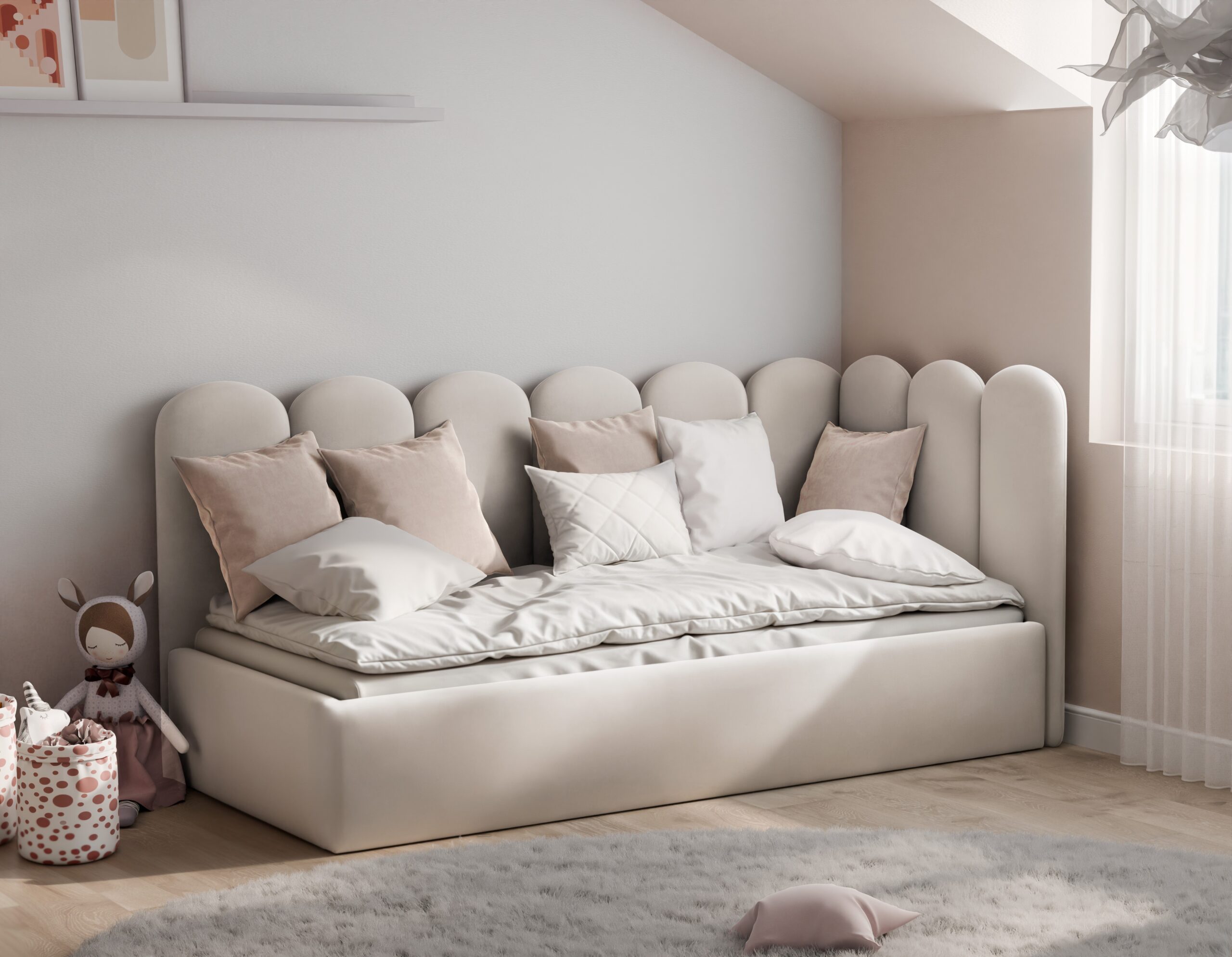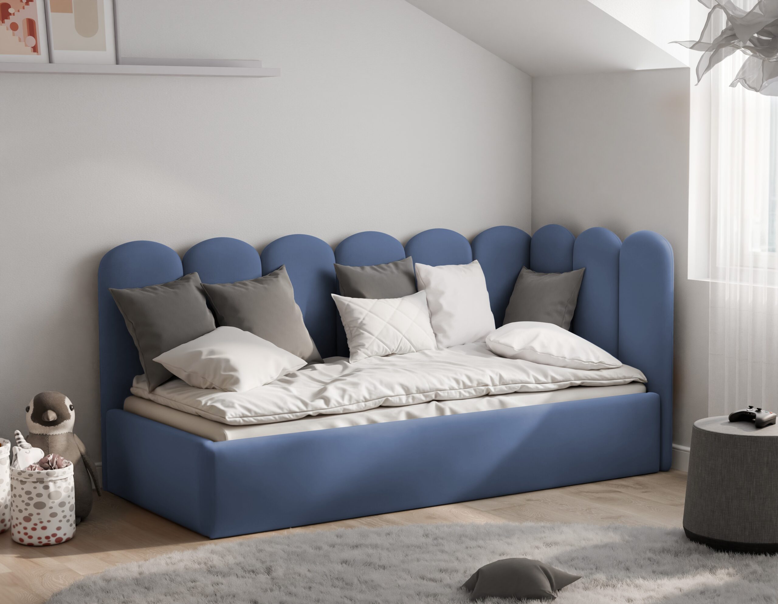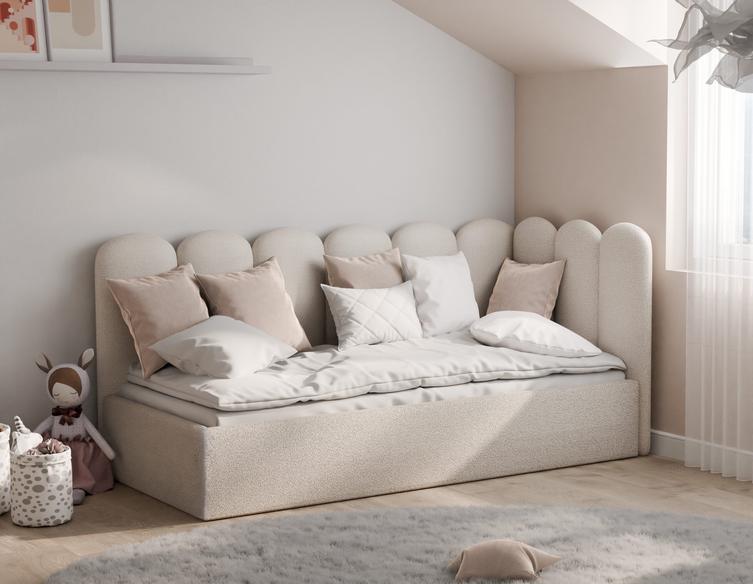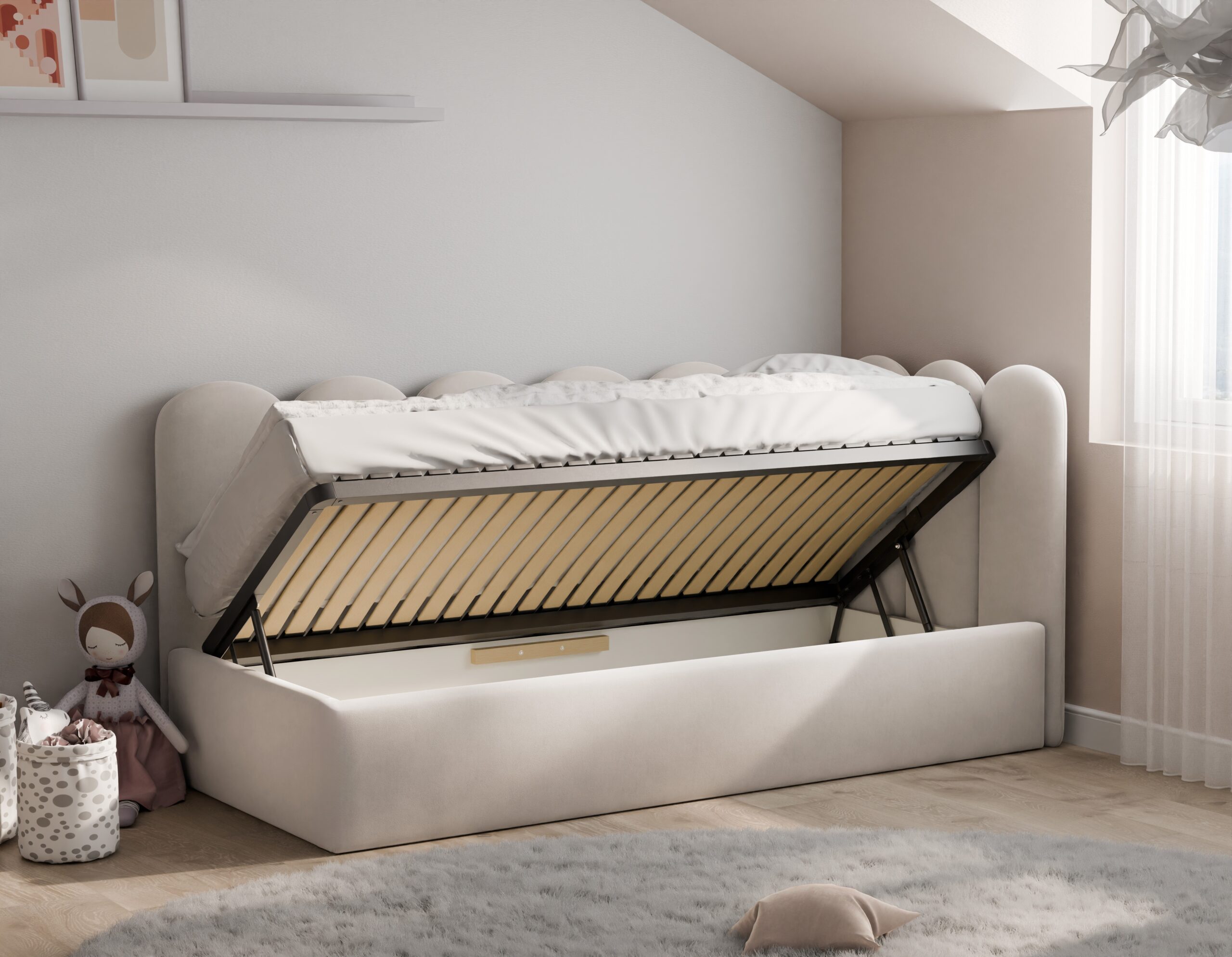 Łóżko młodzieżowe Bubbly to mebel, który wyróżnia się niezwykle przytulnym, zaokrąglonym oparciem przypominającym chmurki, tworząc bezpieczne i stylowe miejsce do relaksu oraz snu. Model ten jest wyposażony w solidny, podnoszony stelaż z metalową ramą, który zapewnia stabilne podparcie dla materaca oraz wysoki komfort wypoczynku. Przemyślany stelaż wspiera odpowiednią wentylację i przedłuża żywotność materaca.