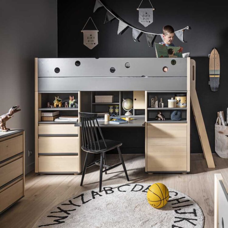 Pod łóżkiem znajduje się w pełni wyposażone biurko z dwiema pojemnymi komodami po bokach – idealne miejsce do nauki, zabawy i twórczych pasji. Drzwi i szuflady z systemem cichego domyku zapewniają komfort i bezpieczeństwo użytkowania każdego dnia.
