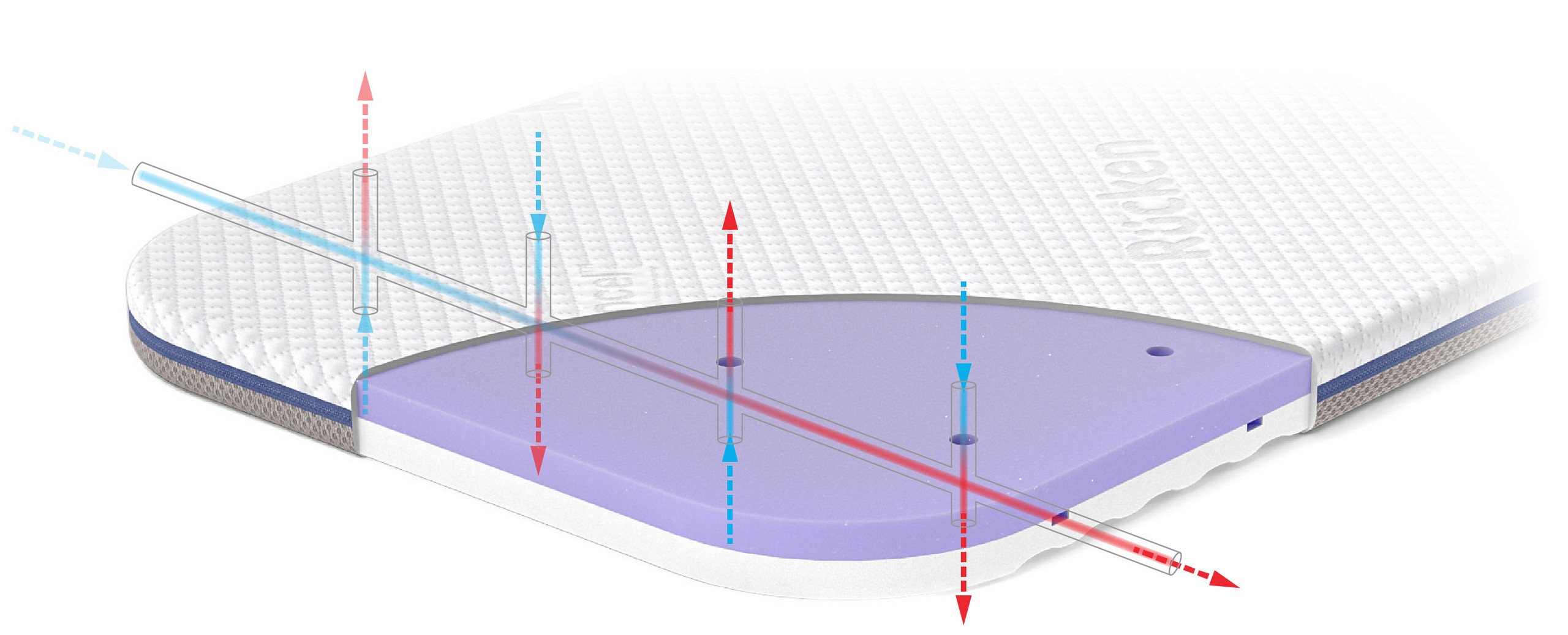 - Liczne poziome kanaliki wentylacyjne znajdujące się na obu powierzchniach do spania są zintegrowane z pionowymi kanalikami przechodzącymi przez grubość materaca oraz kanalikami wyciętymi wewnątrz wkładu. Taka budowa umożliwia swobodny napływ powietrza do środka materacyka dziecięcego, przez siatkę napowietrzającą 3D wszytą na całym obwodzie pokrowca.