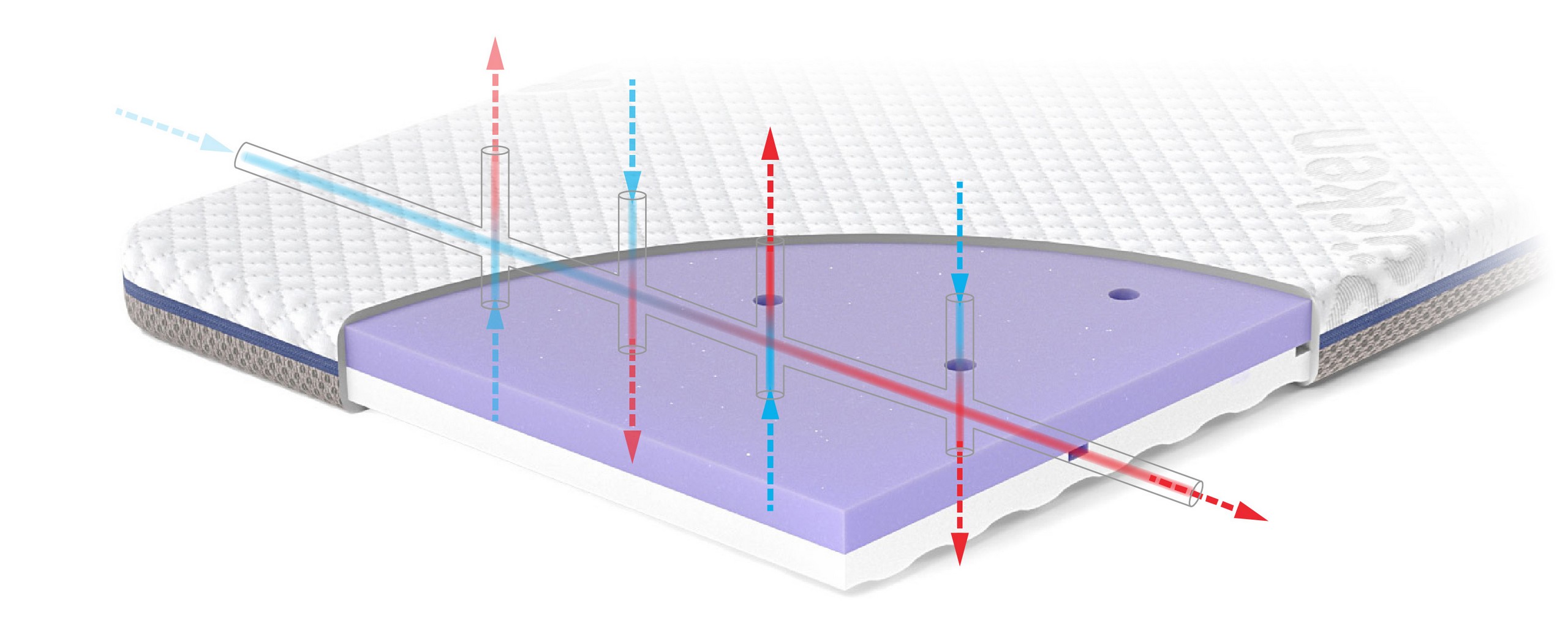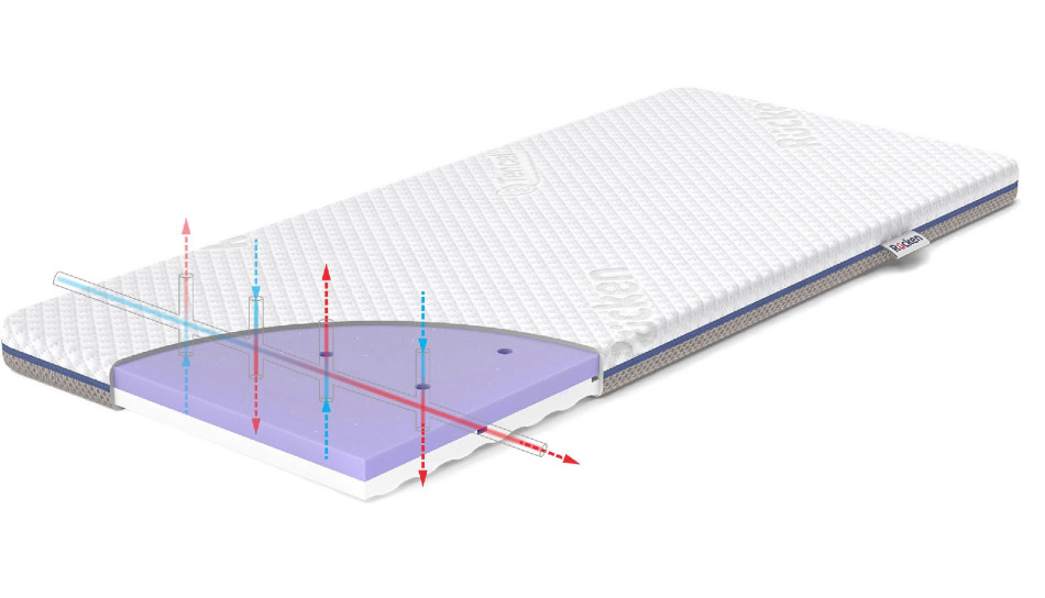 - Liczne poziome kanaliki wentylacyjne znajdujące się na obu powierzchniach do spania są zintegrowane z pionowymi kanalikami przechodzącymi przez grubość materaca oraz kanalikami wyciętymi wewnątrz wkładu. Taka budowa umożliwia swobodny napływ powietrza do środka materacyka dziecięcego, przez siatkę napowietrzającą 3D wszytą na całym obwodzie pokrowca.
