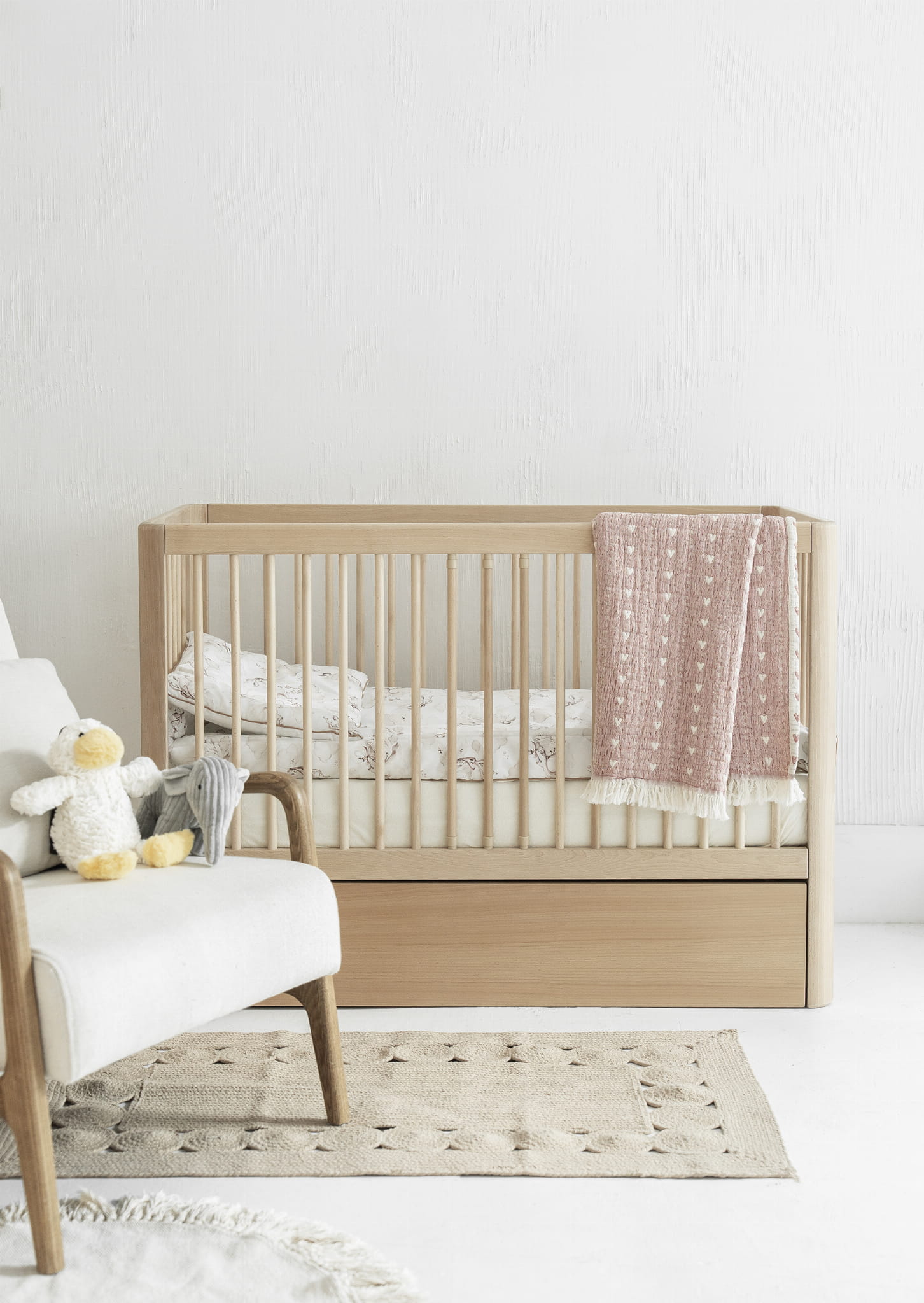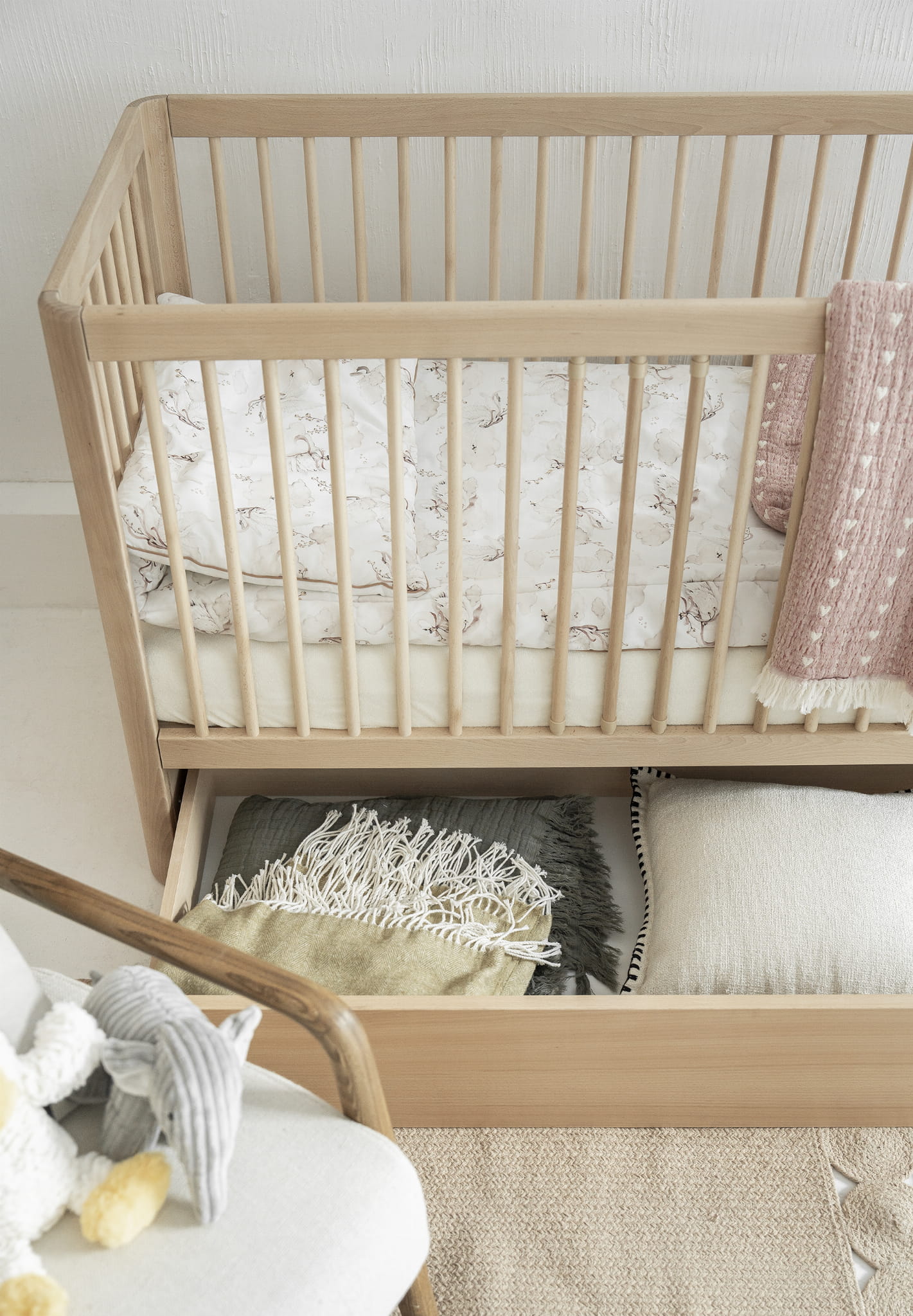 Dodatkowo, do łóżeczka można dokupić szufladę na pościel lub akcesoria oraz barierkę zabezpieczającą, co czyni je wyjątkowo praktycznym rozwiązaniem na dłużej.
