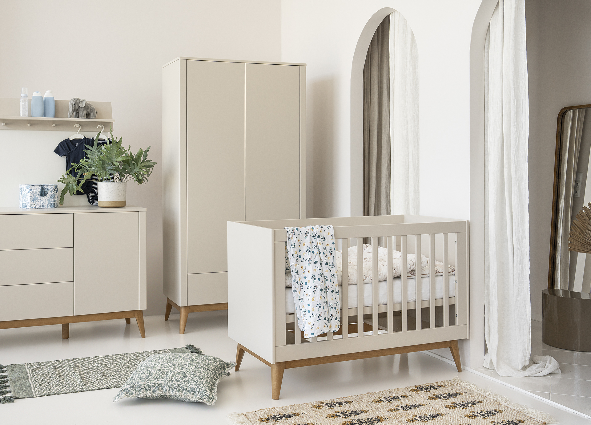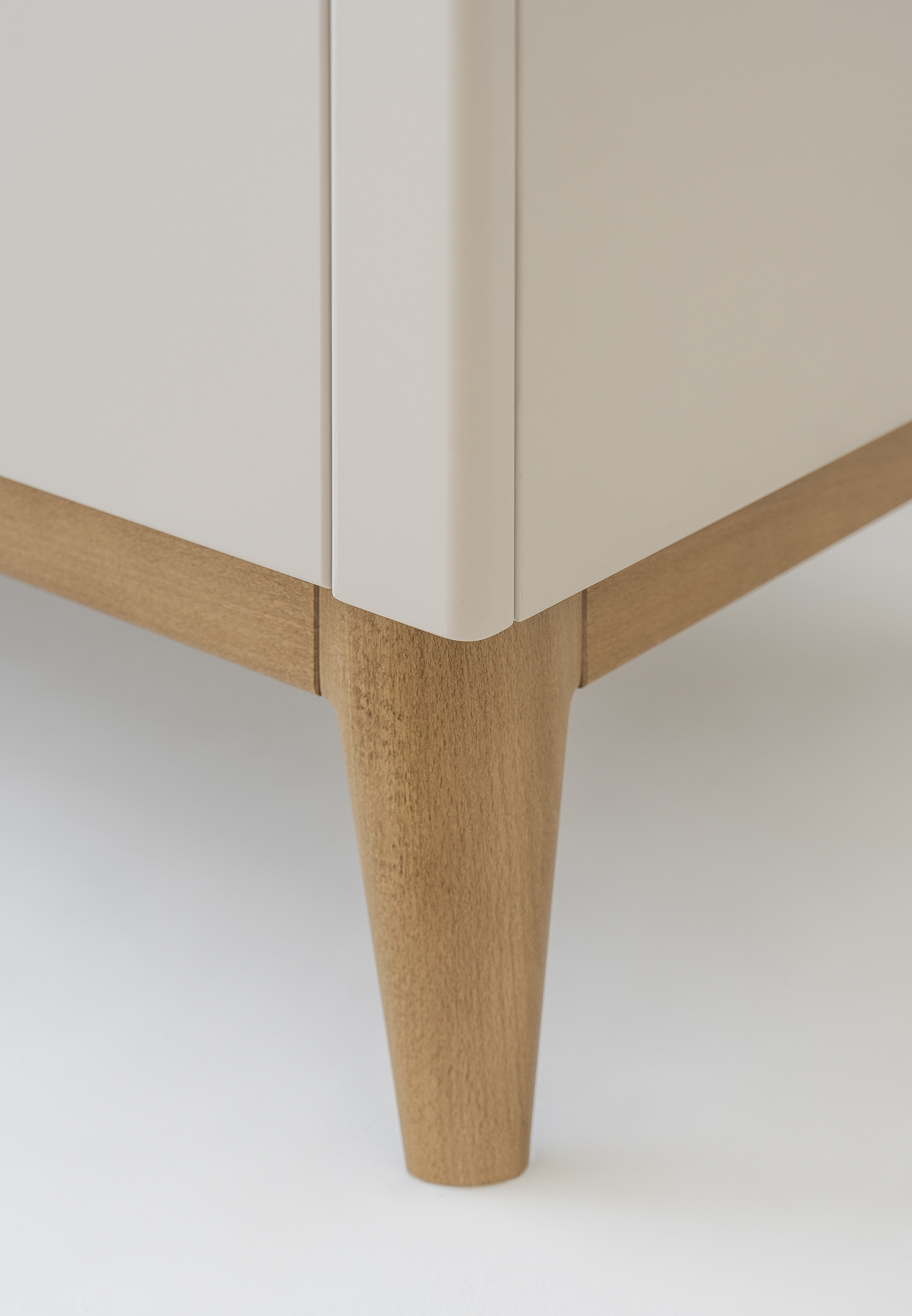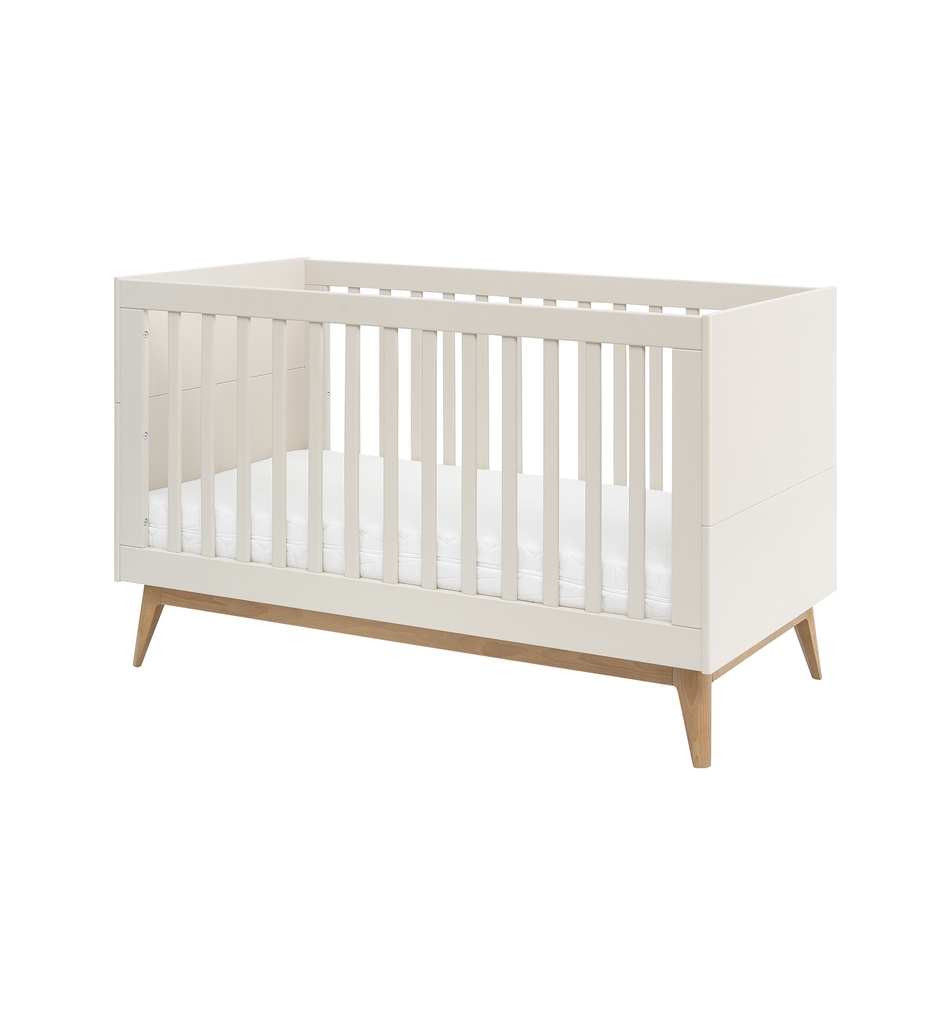 Łóżeczko z kolekcji Seth to nowoczesny mebel, który łączy funkcjonalność, bezpieczeństwo i minimalistyczny design. Zaprojektowane we współpracy z holenderskim studiem projektowym, wyróżnia się gładkimi frontami bez uchwytów, zaokrąglonymi narożnikami oraz eleganckimi, frezowanymi nóżkami z litego drewna bukowego.