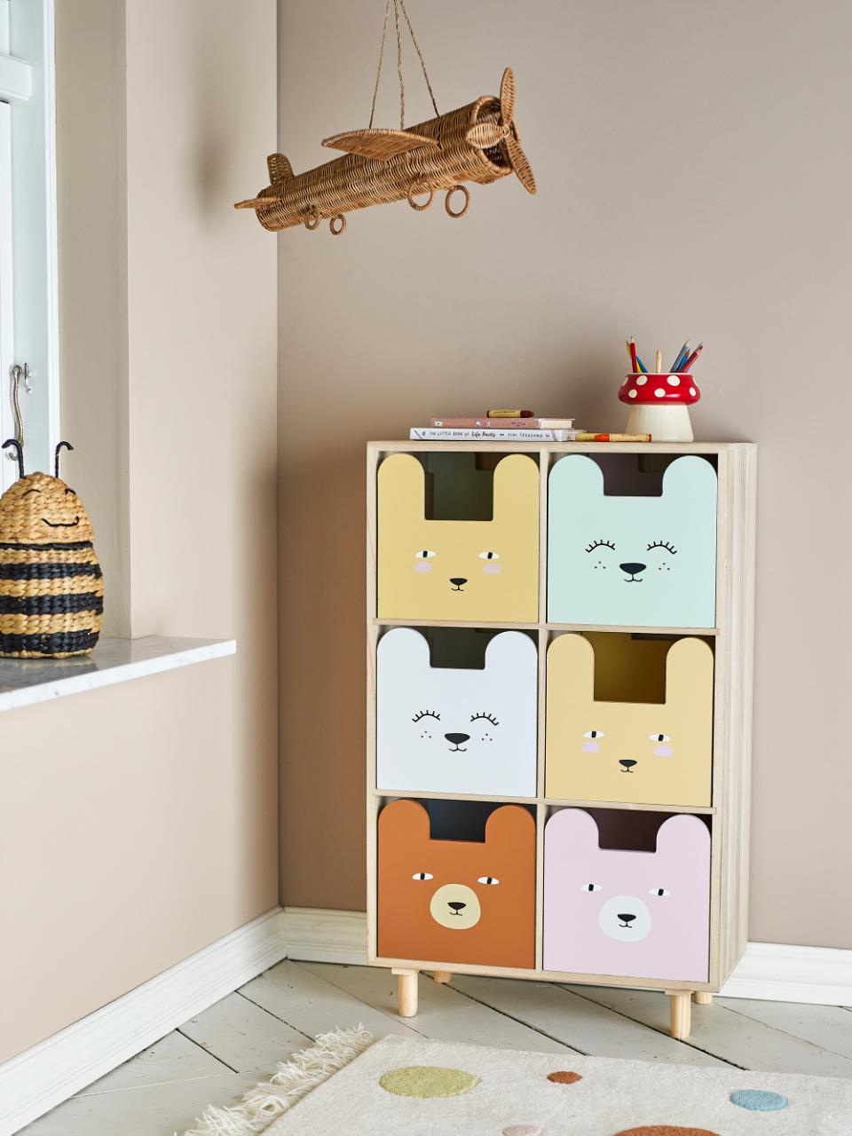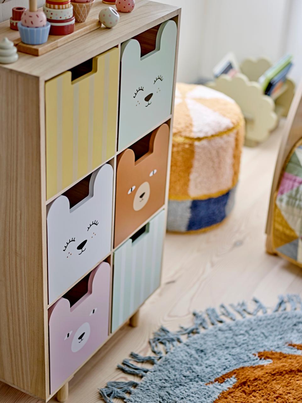 Regał z wesołymi szufladkami dla dzieci duńskiej marki Bloomingville MINI jest ręcznie wykonany, co sprawia, że każdy egzemplarz jest wyjątkowy i niepowtarzalny. Regał łączy w sobie przytulny i funkcjonalny design, który pasuje do każdego pokoju. Szuflady są odwracalne, dzięki czemu można wybierać między uroczymi motywami zwierzątek, wzorami lub prostą, naturalną stroną drewna.
