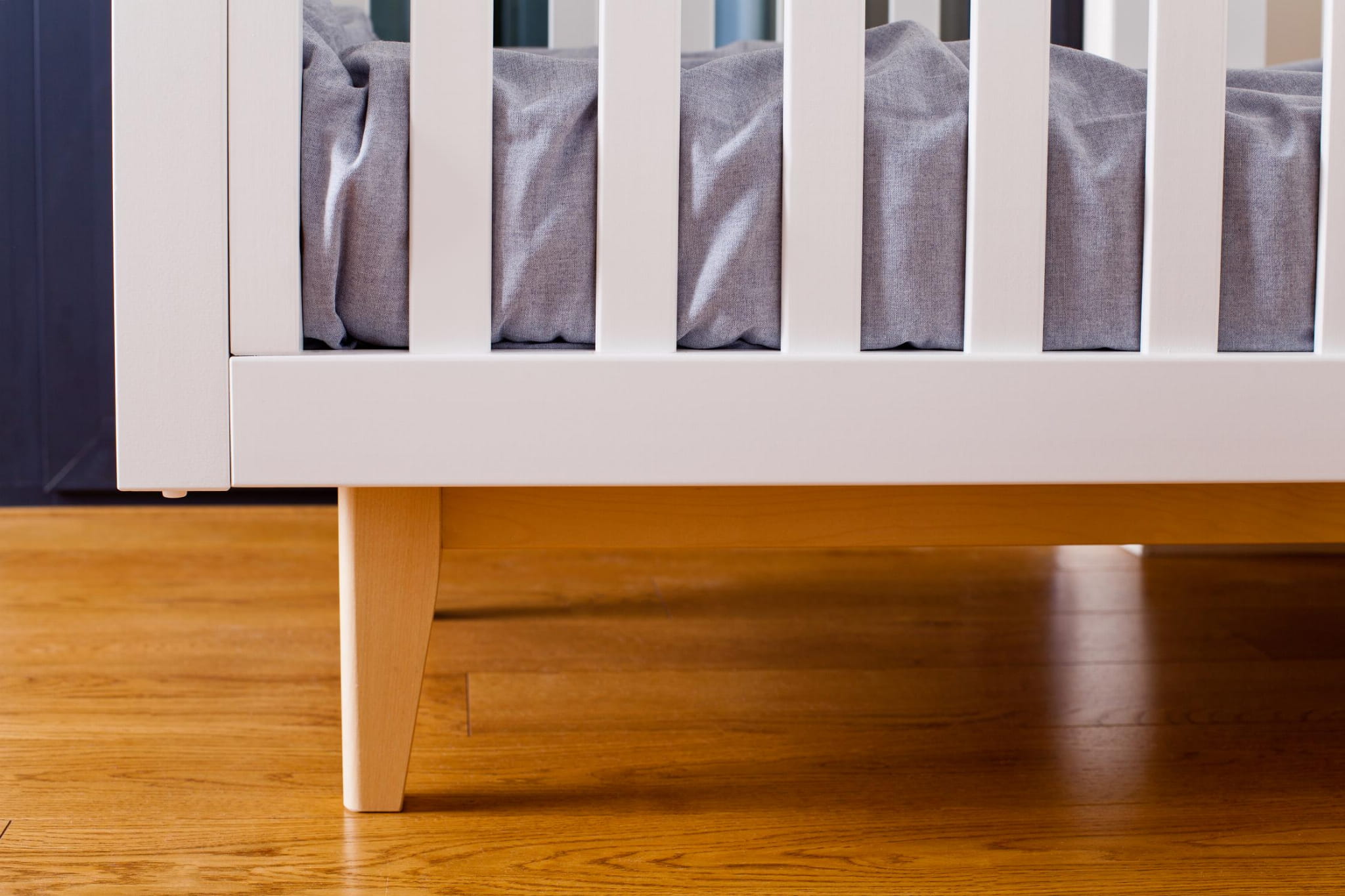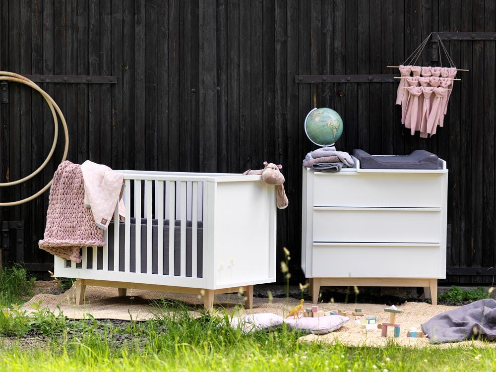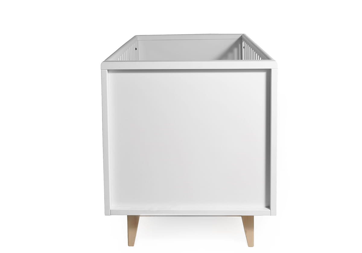 Łóżeczko występuje w kolorze białym, nogi w kolorze naturalnego drewna.