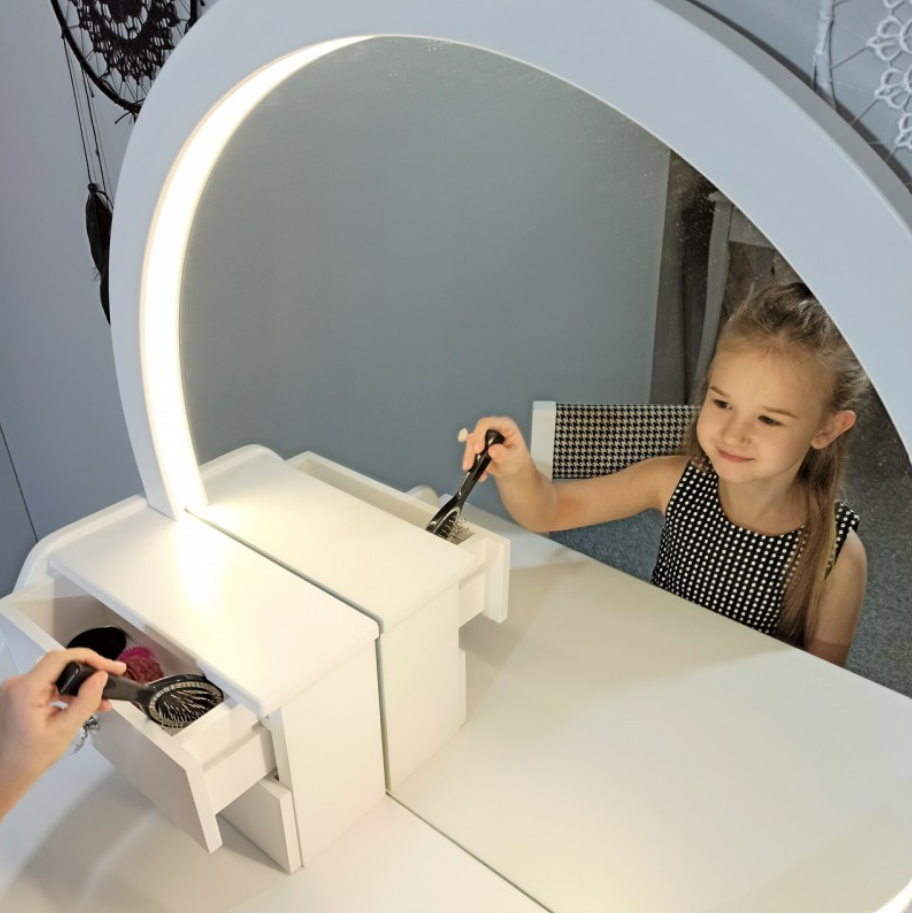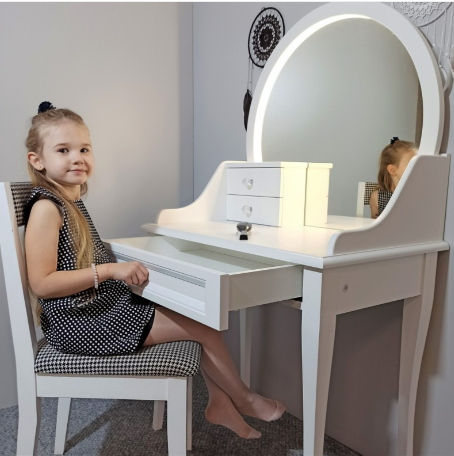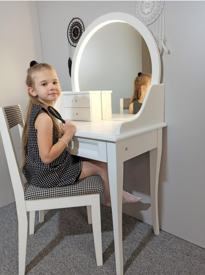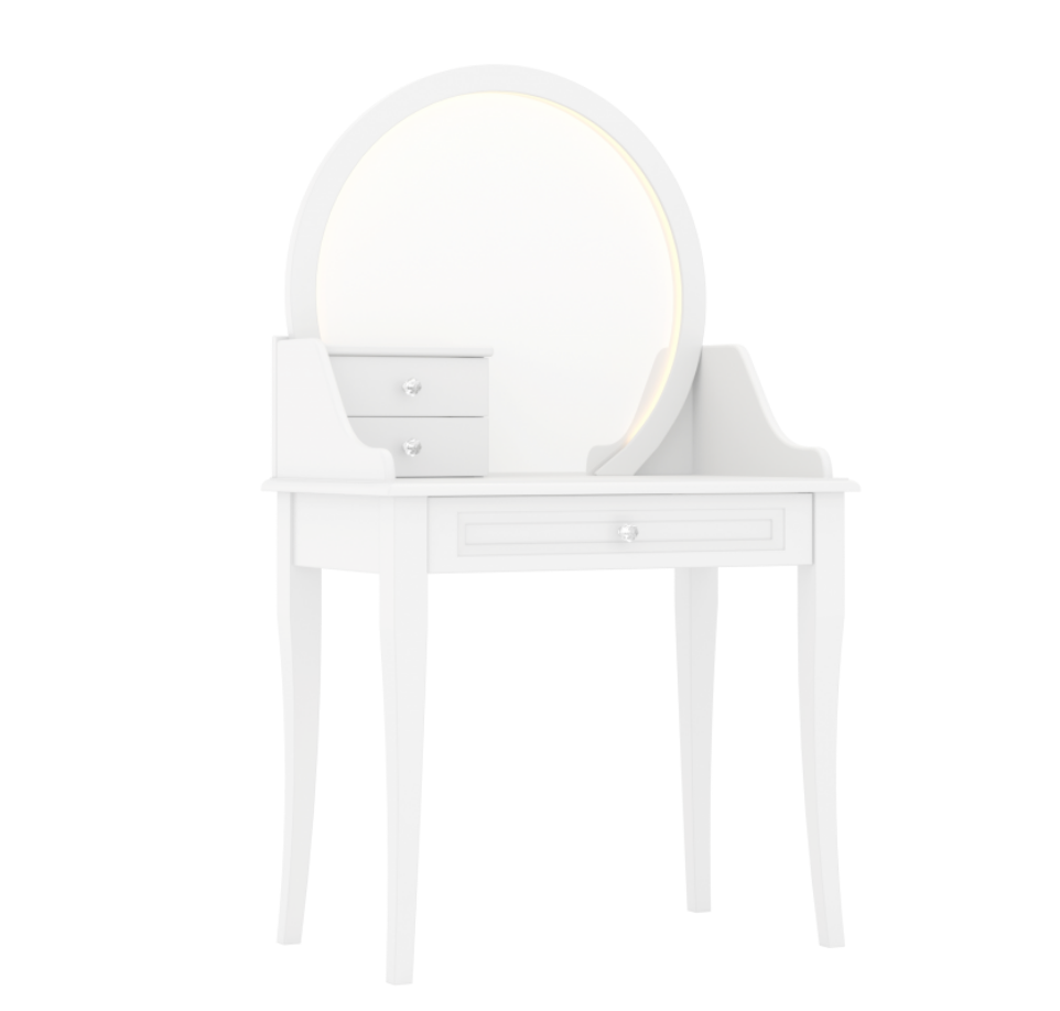 Elegancka toaletka Charlotte z dużym okrągłym lustrem emanuje wyszukanym stylem i jest doskonałym dodatkiem do Twojej sypialni lub pokoju dziecka. Zapewni nie tylko praktyczną powierzchnię użytkową ale również doda wyjątkowego uroku i luksusu do wnętrza.
