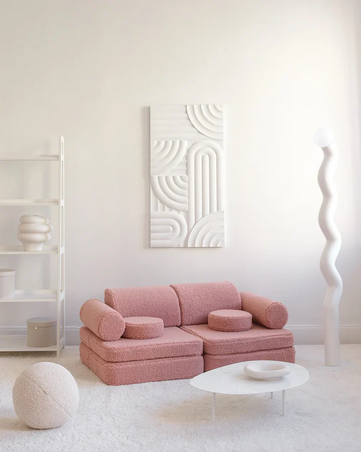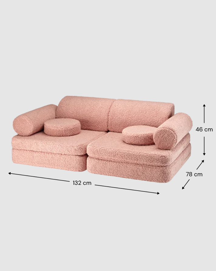 Niezależnie od tego, czy służy do czytania, odpoczynku, czy aktywnej zabawy, ta miękka i przestronna sofa wnosi komfort i kreatywność do każdej sypialni dziecięcej lub bawialni. Obita luksusową tkaniną typu teddy (baranek) w radosnym odcieniu różu, stanowi stylowy i funkcjonalny element wyposażenia. Dedykowana dla dzieci w wieku od 3 do 9 lat.