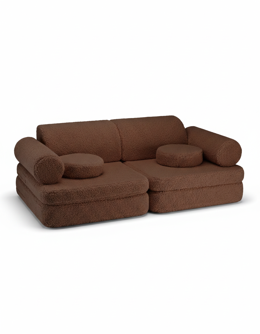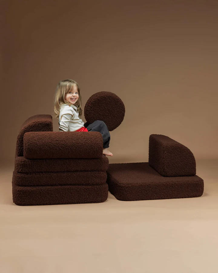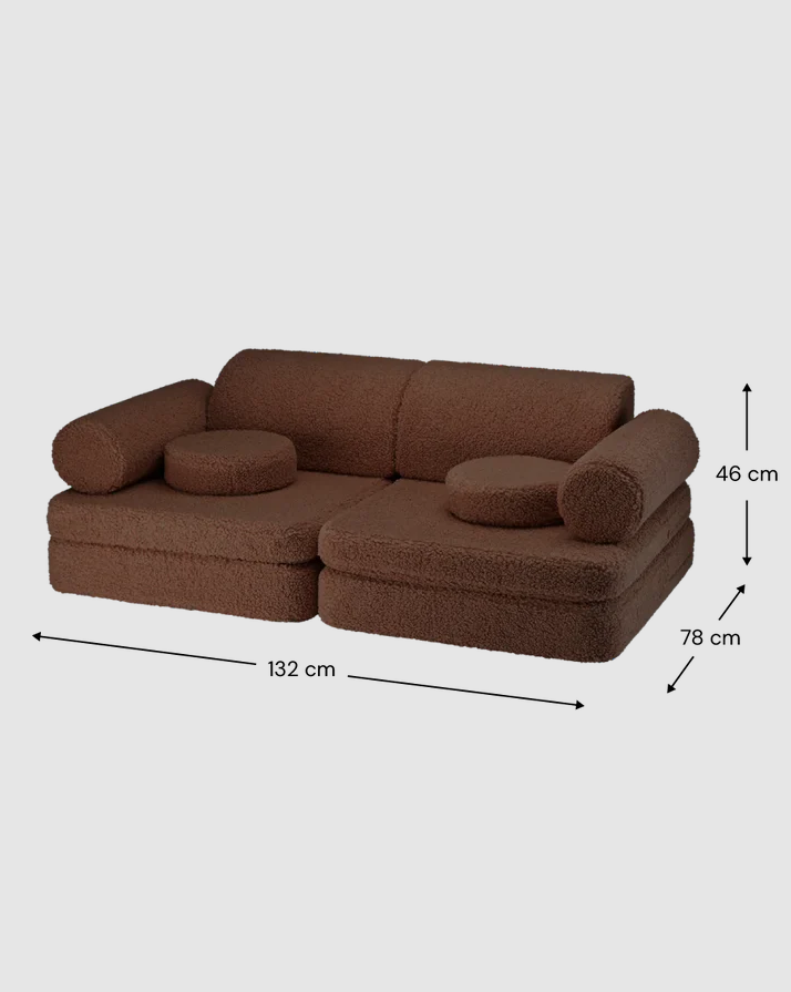 Stwórz przytulny kącik z dziecięcą kanapą Warm Hazel – elegancką sofą w kolorze głębokiego, ciemnego brązu, która idealnie wkomponuje się w każde domowe wnętrze. Wykonana ręcznie w Europie i obita pluszową tkaniną typu teddy (baranek), wnosi do pokoju spokój i naturalny wygląd, pozostając jednocześnie niezwykle miękką w dotyku.