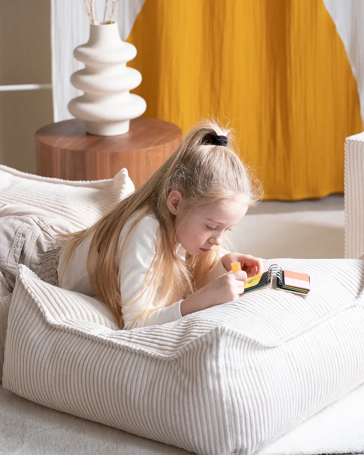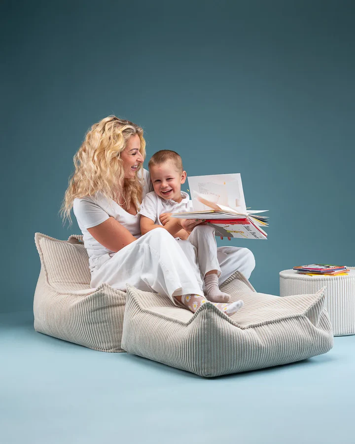 Dzięki miękkiej, wysokiej jakości tkaninie – szerokiemu sztruksowi w śmietankowym odcieniu bieli – oraz ponadczasowemu designowi, ten lekki i łatwy do przenoszenia mebel wnosi zarówno styl, jak i komfort do każdego wnętrza. Dedykowana dla dzieci w wieku od 3 do 9 lat.