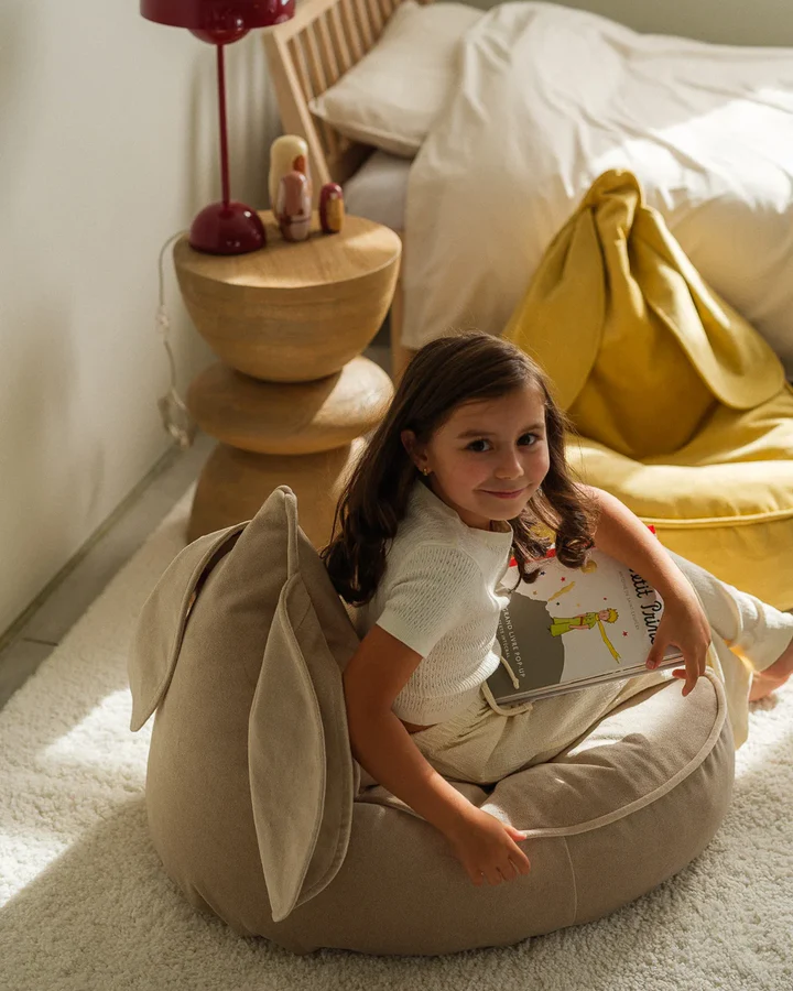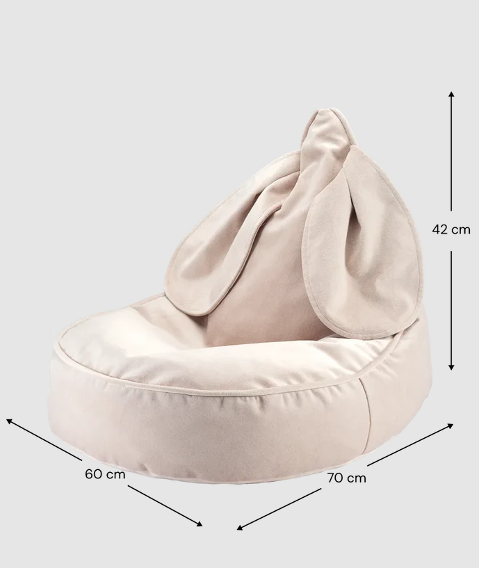 Zaprojektowany z myślą o dzieciach fotel tworzy bezpieczną i stylową przestrzeń, zachęcając do odpoczynku w otoczeniu miękkości. Królicze uszy i przytulny kształt sprawiają, że pufa staje się ulubionym punktem w pokoju, a jej lekkość pozwala maluchom na swobodne przesuwanie jej tam, gdzie akurat toczy się zabawa. Dedykowana dla dzieci w wieku od 3 do 7 lat.