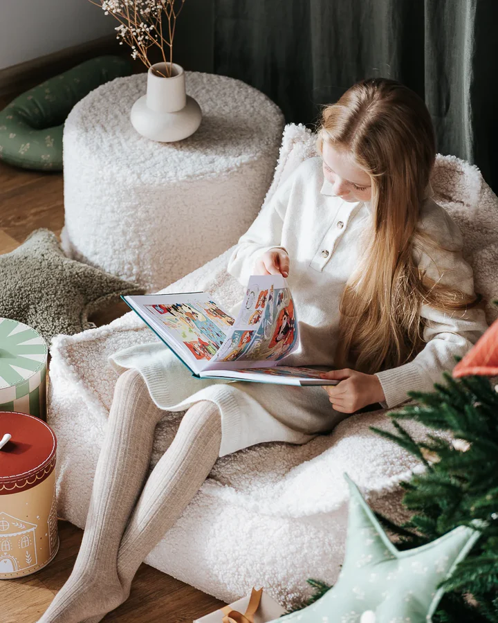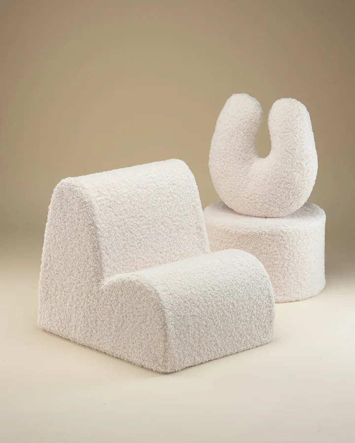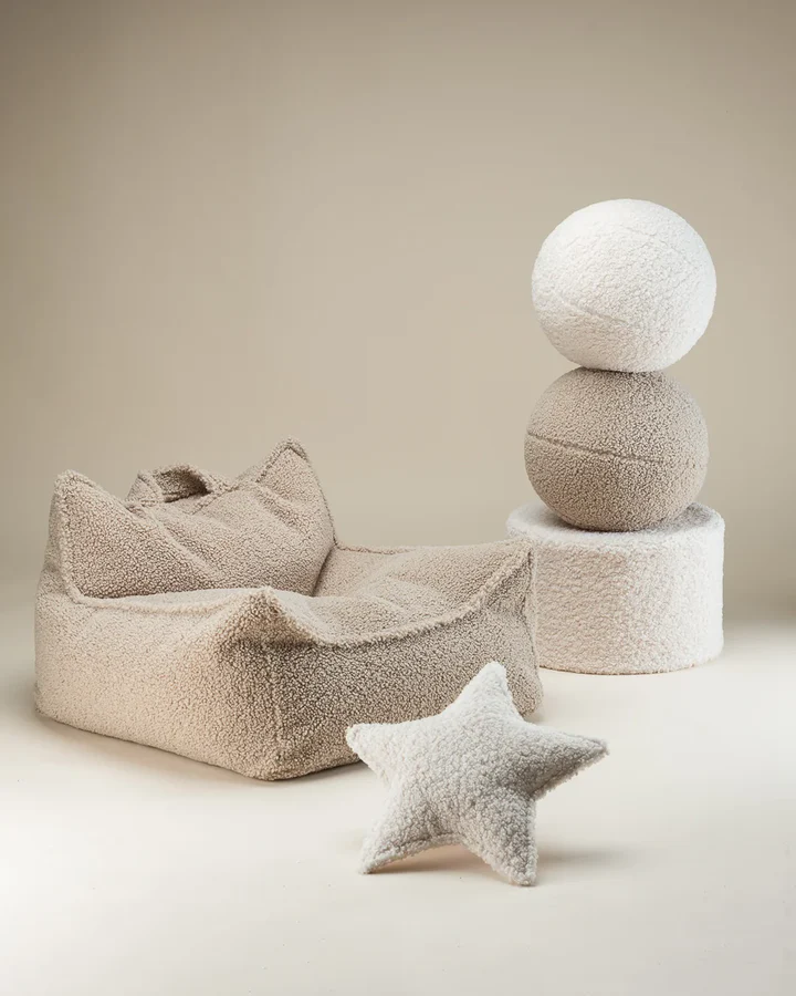 Ten przemyślany mebel jest niezwykle lekki i łatwy do przesuwania, co pozwala dzieciom na swobodną zabawę i samodzielne aranżowanie kącika wypoczynkowego. Obita luksusową tkaniną typu teddy (baranek) w subtelnym, śmietankowym odcieniu bieli, pufa stanowi stylowe uzupełnienie puf sako i foteli, wnosząc funkcjonalność do każdego dziecięcego pokoju. Dedykowana dla dzieci w wieku od 3 do 7 lat.