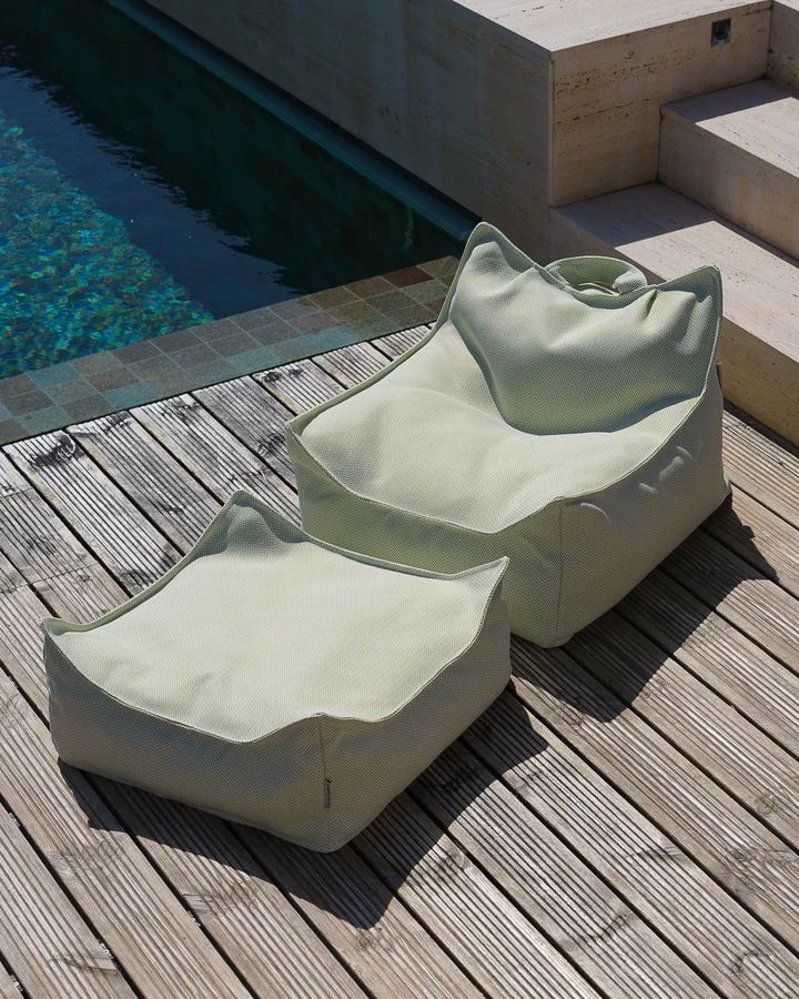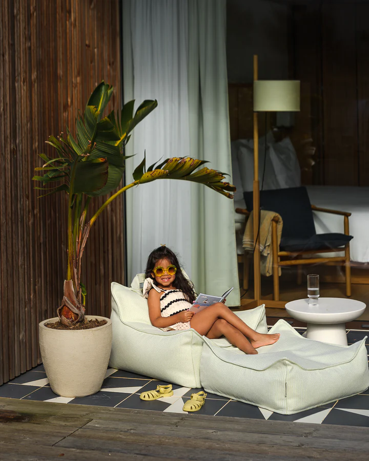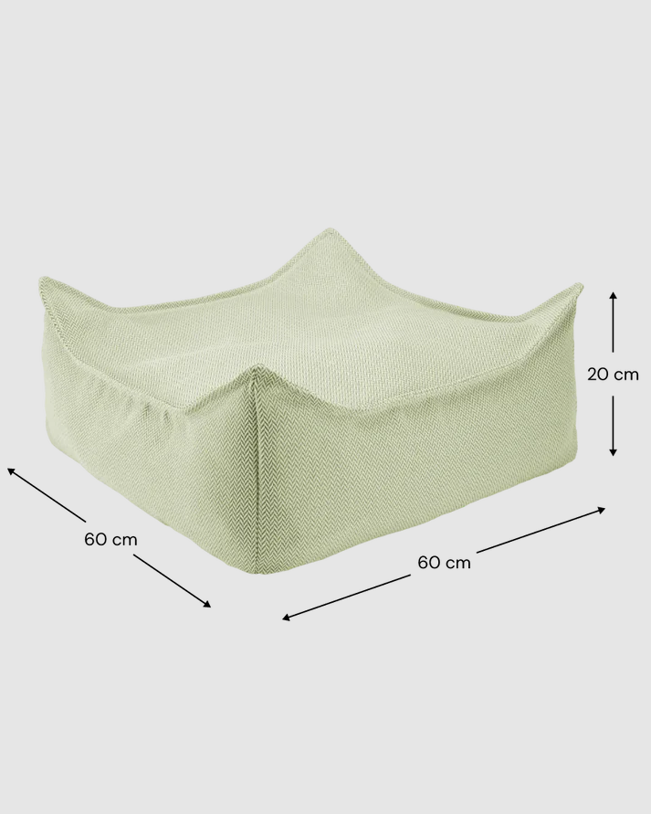 Zestaw zawiera lekką pufę sako oraz dopasowany ottoman, wykonane z wysokiej jakości tkaniny odpornej na warunki atmosferyczne. Pufa zapewnia miękkie wsparcie podczas czytania lub odpoczynku pod gołym niebem, natomiast wszechstronny ottoman służy jako podnóżek, dodatkowe siedzisko lub stabilna powierzchnia do zabawy. Dzięki odporności na promieniowanie UV oraz chlor, komplet zachowuje swój wygląd nawet przy intensywnym użytkowaniu na zewnątrz. Delikatny zielony kolor i struktura jodełki sprawiają, że zestaw idealnie komponuje się z ogrodową zielenią. Dedykowany dla dzieci w wieku od 3 do 9 lat.