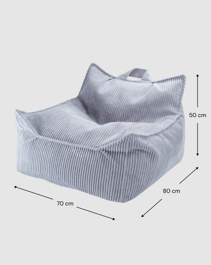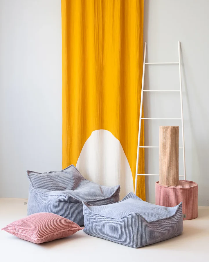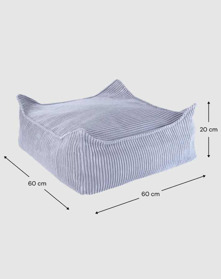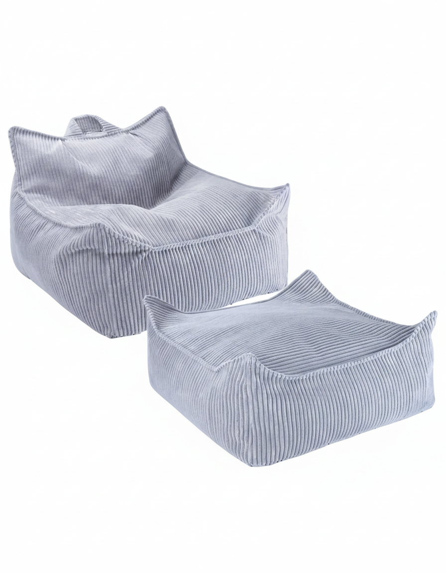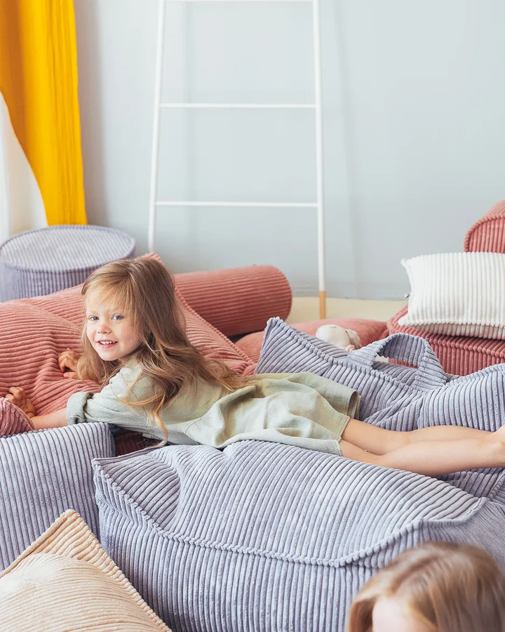 W skład zestawu wchodzi pufa sako o czystych liniach oraz dopasowany ottoman, które wspólnie tworzą przytulny kącik do czytania, relaksu lub zabawy. Pufa zapewnia doskonałe wsparcie dla pleców, natomiast wszechstronny ottoman świetnie sprawdza się jako podnóżek, dodatkowe siedzisko lub kreatywna powierzchnia do zabawy. Oba elementy są lekkie i łatwe do przenoszenia przez dziecko. Obicie z ekologicznego, szerokiego sztruksu w głębokim, jagodowym odcieniu błękitu nadaje wnętrzu stylowy i przytulny charakter. Dedykowany dla dzieci w wieku od 3 do 9 lat.