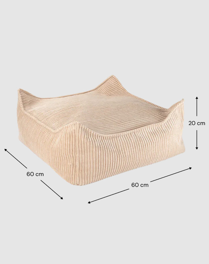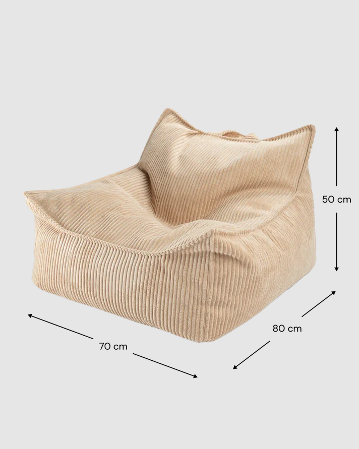 W skład zestawu wchodzi pufa sako o czystych liniach oraz dopasowany ottoman, które wspólnie tworzą przytulny kącik do czytania, relaksu lub zabawy. Pufa zapewnia doskonałe wsparcie dla pleców, natomiast wszechstronny ottoman świetnie sprawdza się jako podnóżek, dodatkowe siedzisko lub kreatywna powierzchnia do zabawy. Oba elementy są lekkie i łatwe do przenoszenia przez dziecko. Obicie z ekologicznego, szerokiego sztruksu w ciepłym odcieniu brązowego cukru nadaje wnętrzu przytulny charakter. Dedykowany dla dzieci w wieku od 3 do 9 lat.