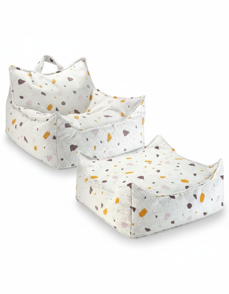W skład zestawu wchodzi charakterystyczna pufa sako o czystych liniach oraz dopasowany ottoman, które wspólnie tworzą przytulny kącik do czytania, relaksu lub zabawy. Pufa zapewnia doskonałe wsparcie dla pleców, natomiast wszechstronny ottoman świetnie sprawdza się jako podnóżek, dodatkowe siedzisko lub kreatywna powierzchnia do układania zabawek. Oba elementy są lekkie i łatwe do przenoszenia przez dziecko. Unikalny wzór imitujący marmurowe lastryko nadaje wnętrzu nowoczesny charakter. Dedykowany dla dzieci w wieku od 3 do 9 lat.