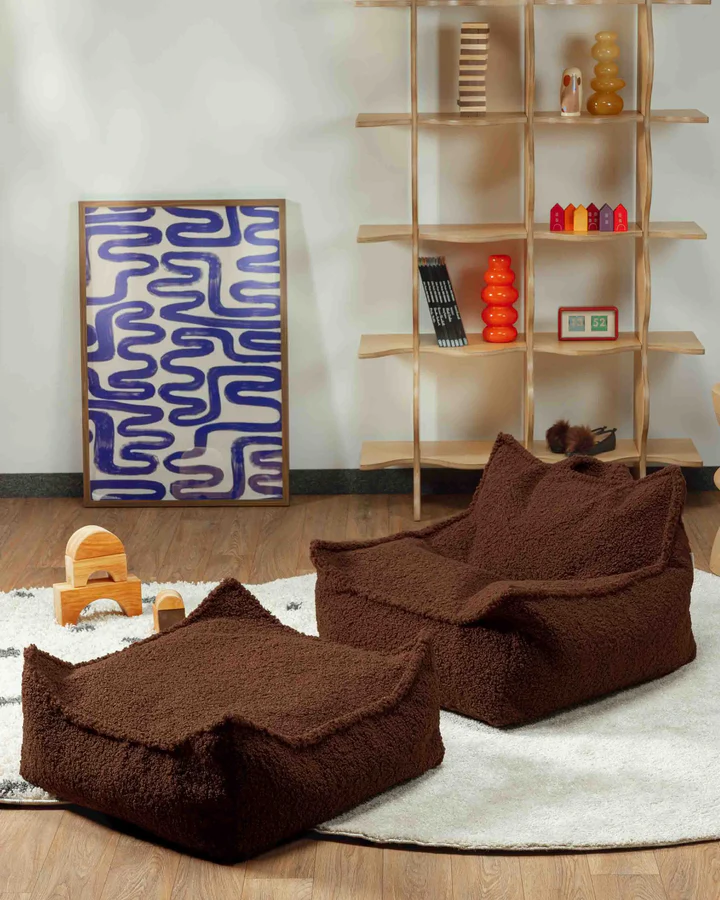 W skład zestawu wchodzi pufa sako o czystych liniach oraz dopasowany ottoman, które wspólnie tworzą przytulny kącik do czytania, relaksu lub zabawy. Pufa zapewnia doskonałe wsparcie dla pleców, natomiast wszechstronny ottoman świetnie sprawdza się jako podnóżek, dodatkowe siedzisko lub kreatywna powierzchnia do zabawy. Oba elementy są lekkie i łatwe do przenoszenia przez dziecko. Obicie z luksusowo miękkiej tkaniny typu teddy (baranek) w ciepłym, kawowym odcieniu nadaje wnętrzu wyjątkowo przytulny charakter. Dedykowany dla dzieci w wieku od 3 do 9 lat.