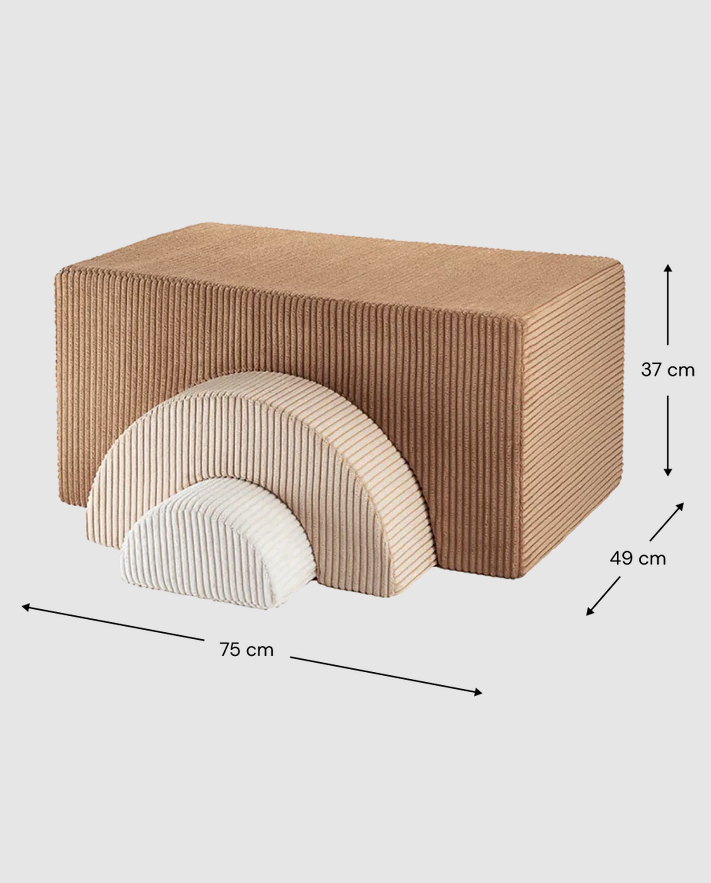 Ten przemyślany i wszechstronny zestaw zachęca do wyobraźni, aktywnej zabawy oraz interakcji społecznych. Wykonany z miękkiego szerokiego sztruksu, jest nie tylko stylowym dodatkiem do pokoju dziecięcego, ale przede wszystkim bezpiecznym narzędziem do rozwijania zdolności motorycznych. Dedykowany dla dzieci w wieku od 3 do 7 lat.