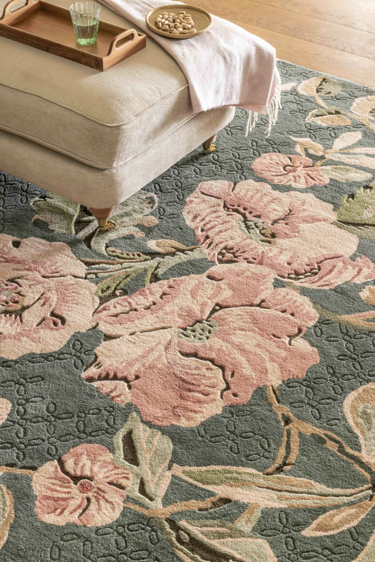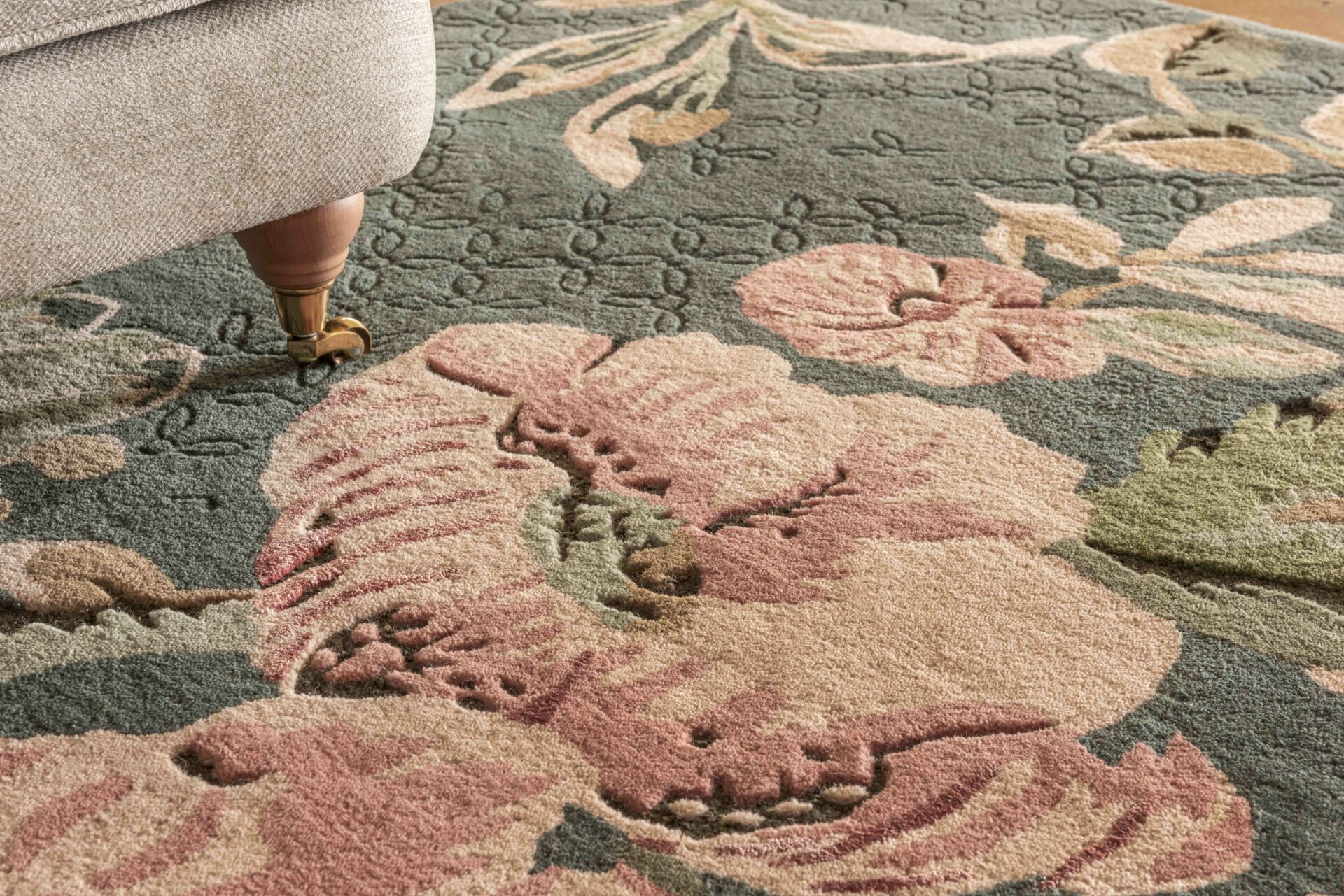 Dywan Aylworth Trail Fern Green brytyjskiej marki Laura Ashley to połączenie luksusowej jakości z artystycznym, kwiatowym wzornictwem. Malarskie hibiskusy i wijące liście tworzą wyrafinowaną kompozycję, która wnosi do wnętrza ciepło, harmonię i ponadczasowy styl.